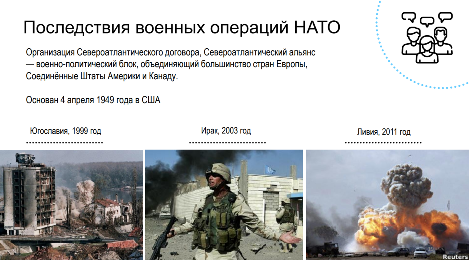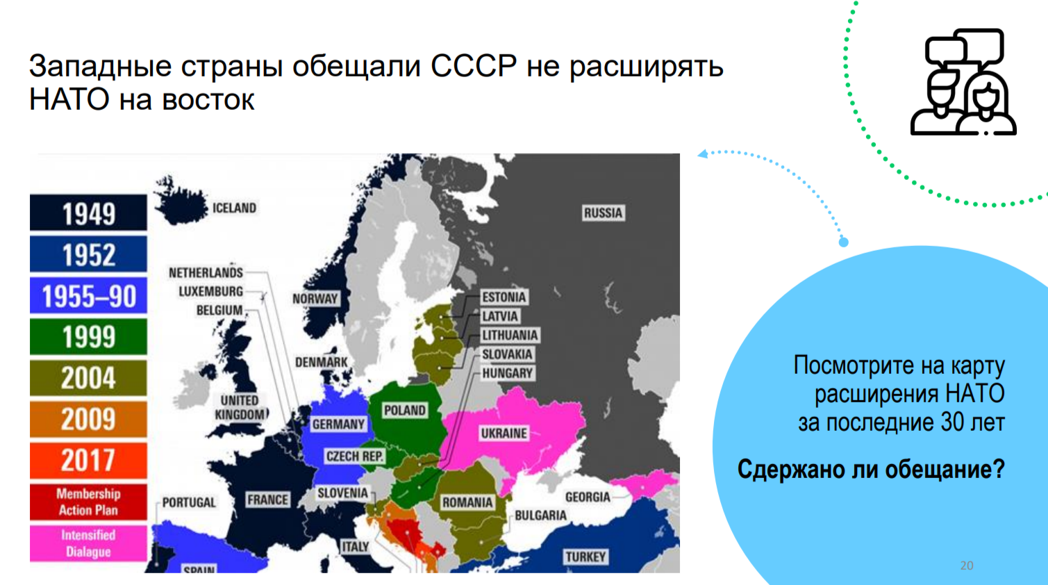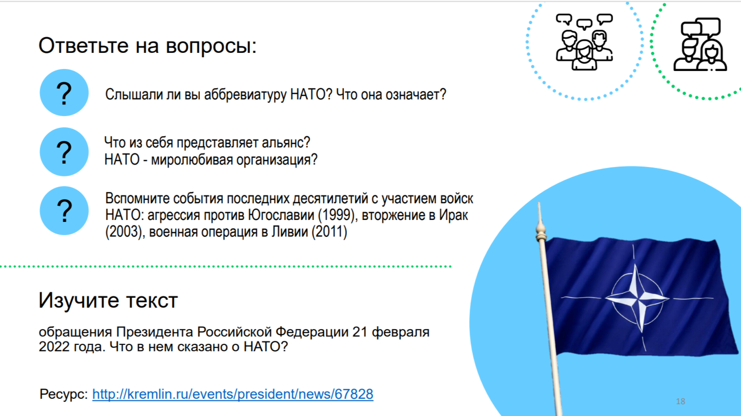 Четыре слайда в презентации для школьников посвящены НАТО и расширению альянса на восток.