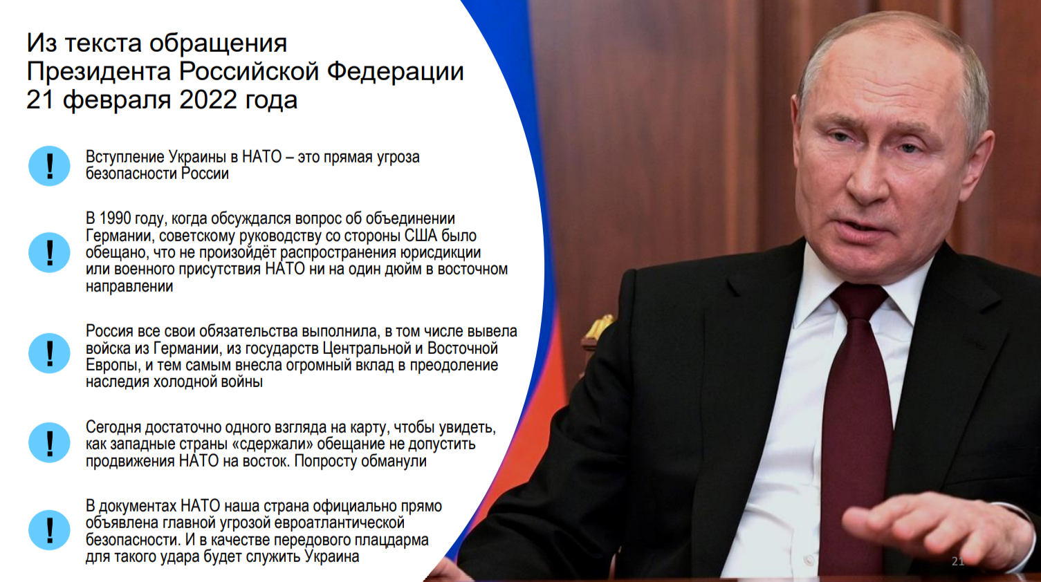 На вводном слайде война России в Украине названа «специальной миротворческой операцией, проводимой нашими вооруженными силами».