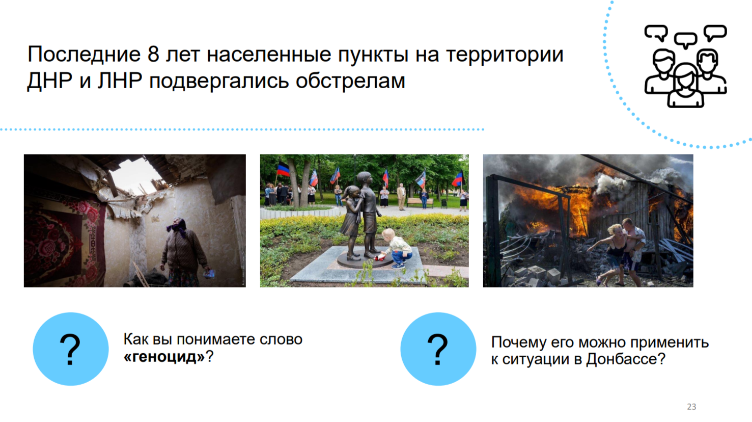 Также детям предлагают подумать о том, почему происходящее в Донбассе можно назвать «геноцидом».