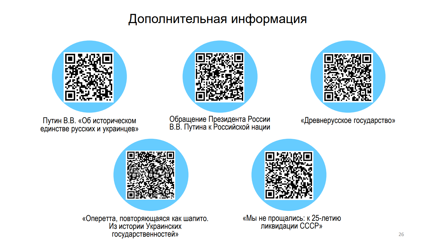 В конце презентации даны ссылки на дополнительную информацию. Они ведут на видеообращение Путина, на статью Путина «Об историческом единстве русских и украинцев», опубликованную на сайте Кремля, и три статьи с сайта «История.РФ»:
