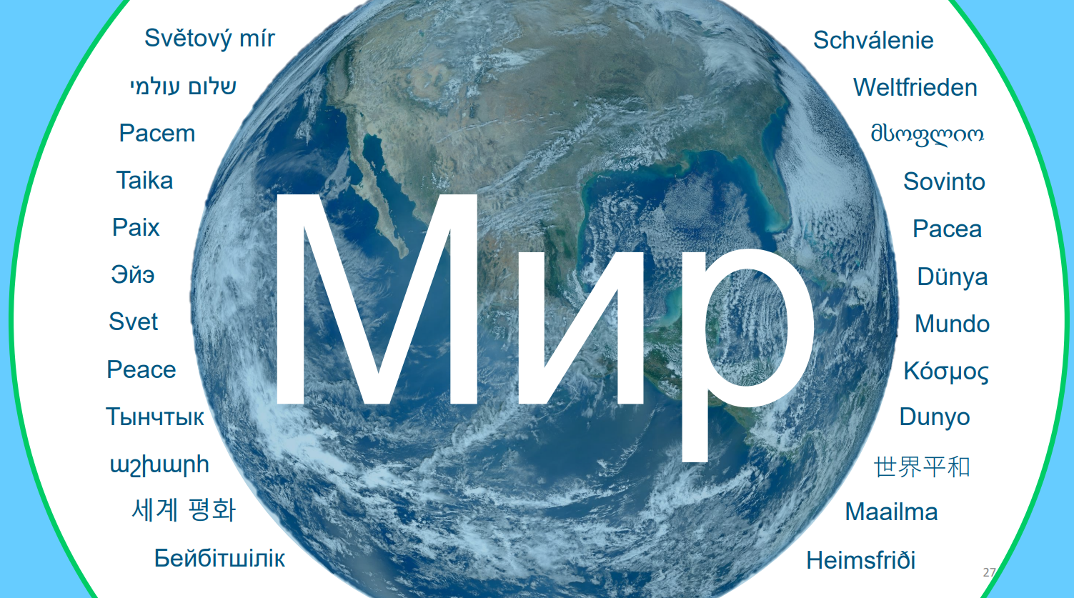 Презентация заканчивается слайдом с надписью «Мир» и фразой «Мир во всем мире», переведенной на разные языки.