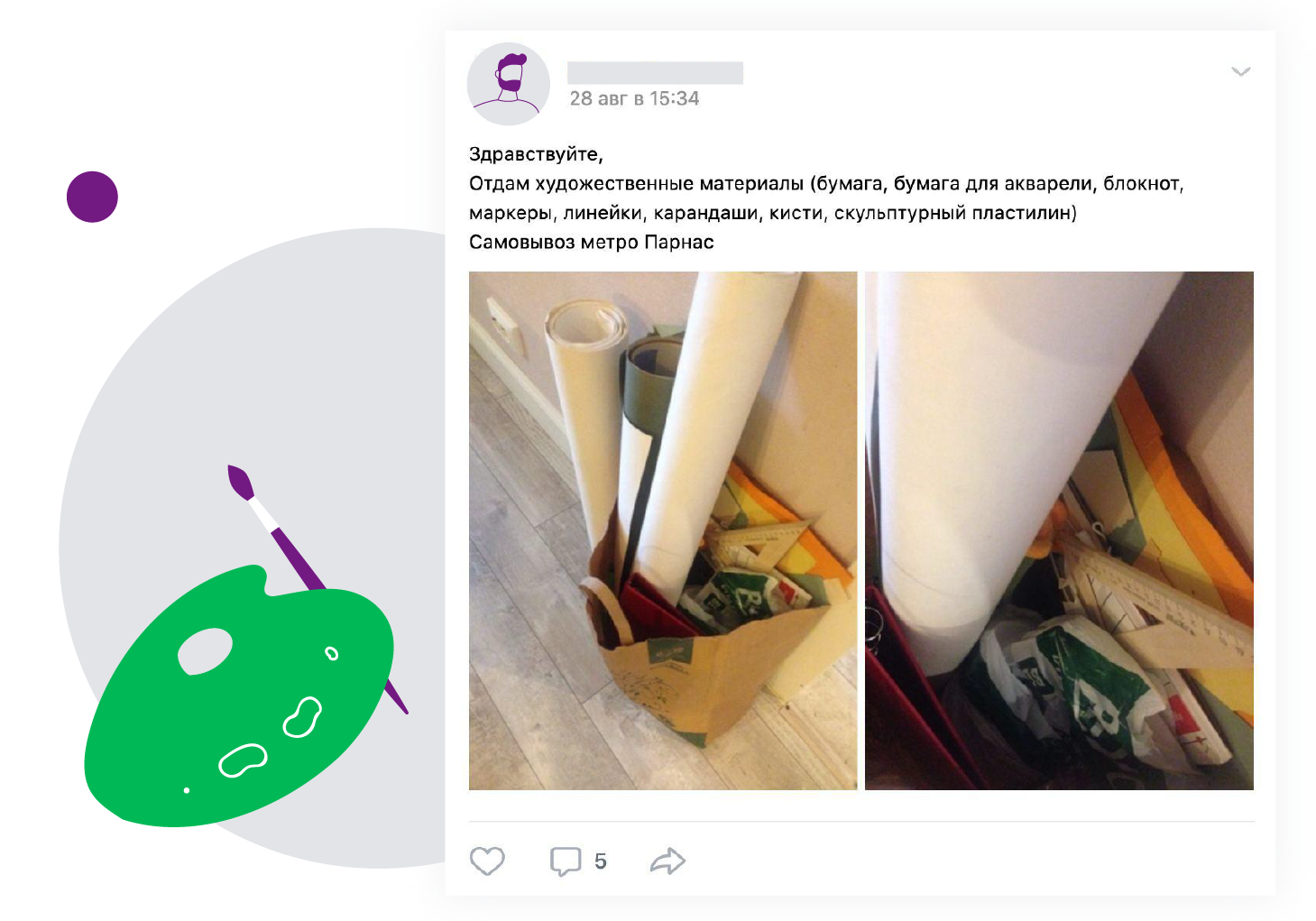 Обмен материалами для творчества — шитья и рисования: пряжей, нитками, пуговицами, красками. Петербуржцы пишут посты с объявлениями в сообществе «Крафтшеринг Петербург».