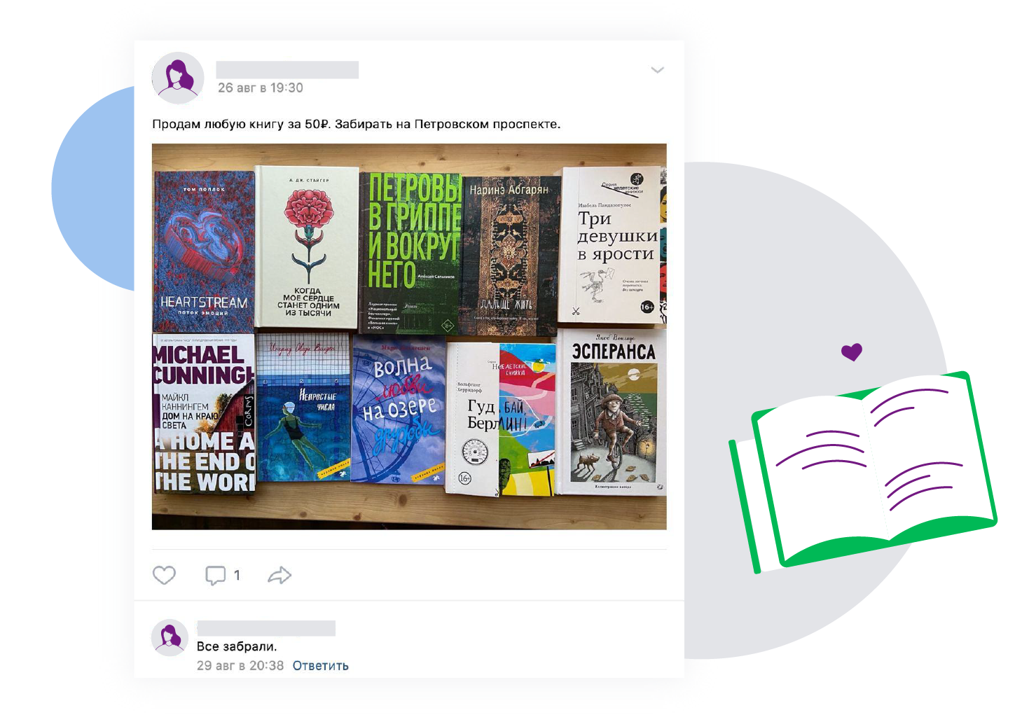 Движение по обмену книг. В Петербурге уголок для буккроссинга есть, например, в арт-клубе «Книги и кофе», а в магазине «Все свободны» иногда выставляют коробки с бесплатными книгами. Участники сообщества «Официальный буккроссинг Санкт-Петербург» обмениваются изданиями, отдают их в дар или за условную сумму.