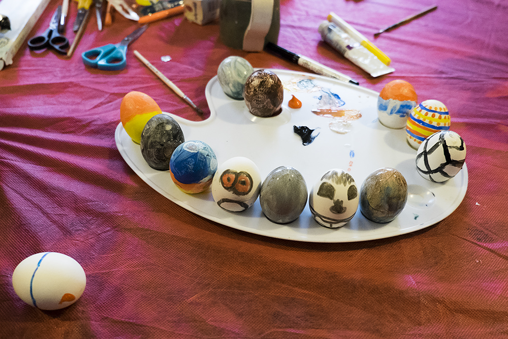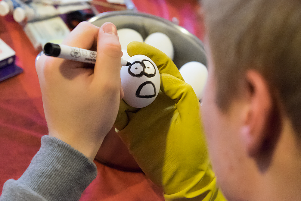Егор — широкоплечий парень в обтягивающей футболке, во время раскрашивания пасхальных яиц вел себя тише всех, увлеченный процессом.