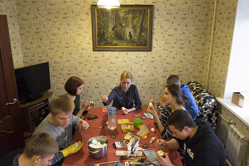 Накануне Пасхи в трапезной шли активные приготовления. Даня и Максим пытаются задеть Ольгу, художницу-волонтерку, которая пришла красить пасхальные яйца вместе с подростками.