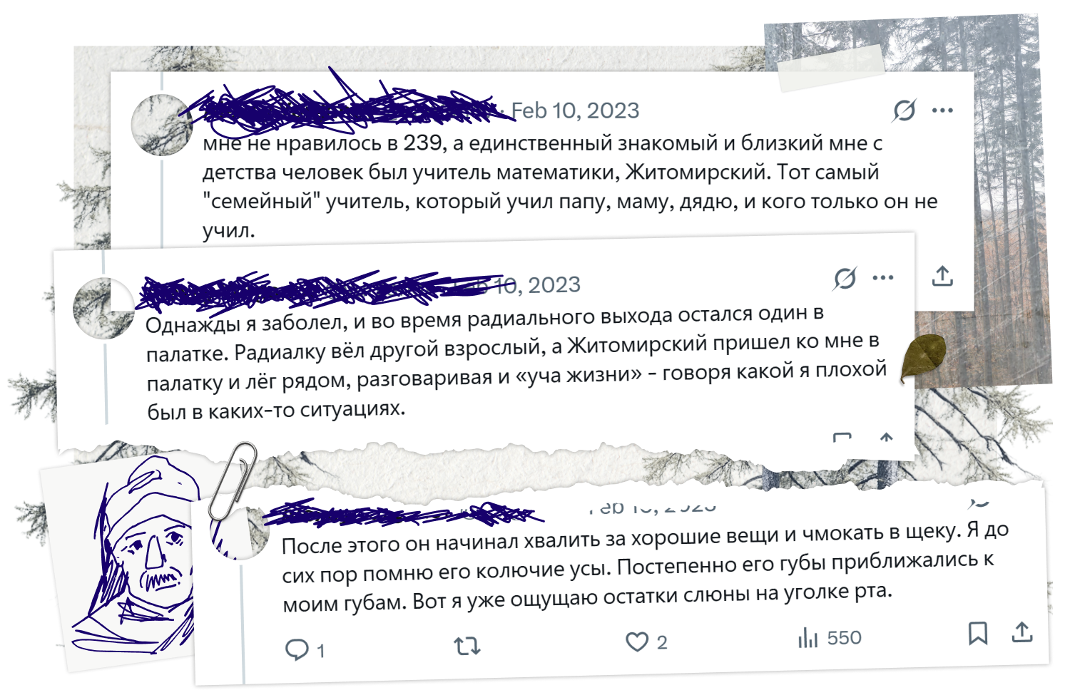 Среди учеников лицея № 239, которые считают себя пострадавшими, — выпускник 2000-х, попросивший не называть его имени. Его рассказ повторяет то, что в своем треде описывал Алексей Юрганов: «Это было в первом большом походе после девятого класса. Физически было тяжело. Несколько человек, включая меня, слегли с температурой: то ли из-за усталости, то ли из-за акклиматизации. Часть людей со вторым преподавателем ушли смотреть на ледник, а я остался в лагере. Житомирский зашел в палатку, когда я был один: целовал, поглаживал, обнимал. У меня температура под 39. Я плохо соображал. У меня не было сил сопротивляться. На следующий, зимний поход я спал с ним в сцепке (так называют два скрепленных спальника, в которые умещаются трое человек), он сам меня так распределил. И там была примерно похожая история…».