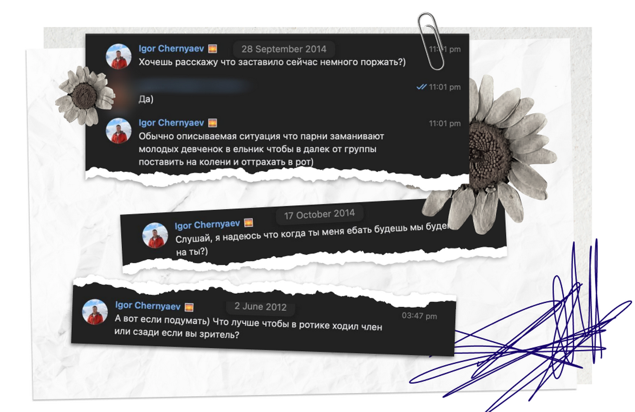 Юля — подруга Маши на год старше — подтвердила «Бумаге», что Черняев регулярно писал ее подружке: «Я видела те сообщения, которые он ей отправлял. Чем дальше, тем бо́льшую жесть Маша начала мне рассказывать. Она думала, что они друзья и что если она будет отвечать, то, может, получит пятерку или его одобрение. Ей было лет 13, она попала в ситуацию, из которой ей сложно было выйти. В какой-то момент Маша действительно тяжело себя чувствовала из-за этих сообщений. Помню, как она мне однажды сказала, что боится, что это может перейти в физическое насилие. Она этого всячески избегала».