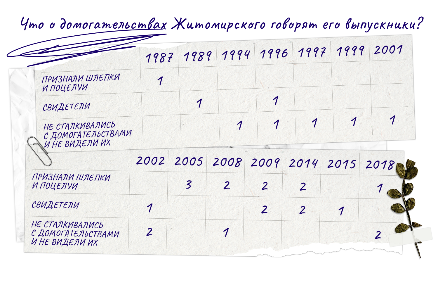 Сколько выпускников Житомирского сталкивались или замечали шлепки и поцелуи учителя. Инфографика: «Бумага»