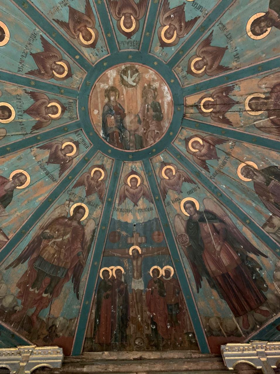 Одна из визитных карточек Каргополя — небеса, то есть живописные сектора, которыми перекрыты основные помещения деревянных храмов. Как правило, в середине неба находится изображение Троицы, а к нему сходится четное число секторов с изображениями небесного воинства, евангелистов, ангелов или сцен распятия. В Каргополе есть целый музей таких небес, перевезенных из разрушающихся храмов со всего Севера.