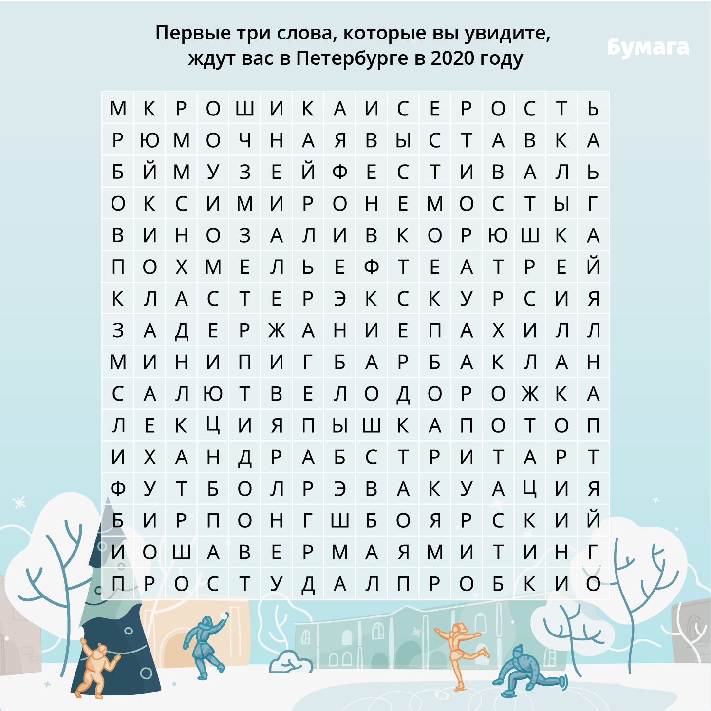 27 декабря 2019 Что ждет вас в Петербурге в 2020 году? Посмотрите на картинку «Бумаги» — и узнаете К Новому году «Бумага» подготовила праздничное гадание — вы сможете узнать, что ждет вас в Петербурге 2020 году. Просто посмотрите на картинку!Инфографика: Анна Кулакова / «Бумага» Авторы: Александра Кириллова Если вы нашли опечатку, пожалуйста, сообщите нам. Выделите текст с ошибкой и нажмите появившуюся кнопку. Подписывайтесь, чтобы ничего не пропустить Все тексты
