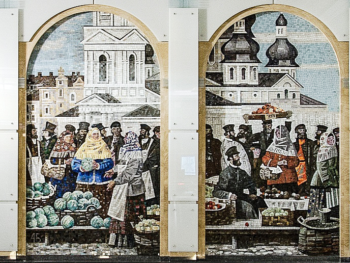 Подземный вестибюль станции метро «Спасская» украшают пять мозаичных панно: три мозаики расположены над эскалаторами, еще две — на боковой стене. Художник Александр Быстров изобразил на панно Сенную площадь XIX века с торговыми рядами и собором Спаса на Сенной. Героями мозаик стали 27 мужчин, шесть женщин и два подростка, многие персонажи были списаны с деятелей русского искусства — например, с Александра Пушкина и Николая Гоголя. Где-то на мозаиках есть и молодой Федор Достоевский, а также его герои: Родион Раскольников, Соня Мармеладова, Парфен Рогожин и Настасья Филипповна.