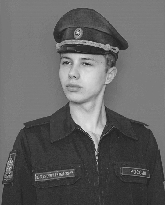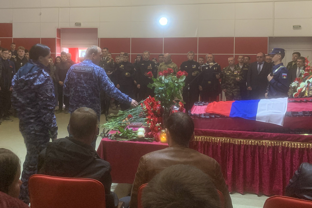 Groups of people gather outside the Sunrise Youth and Leisure Center in Kirishi. Almost everyone is holding red carnations — they have come to a civil memorial service for guards marine Alexander Yegorov. One of the deceased man’s twenty-year-old friends has brought black roses. Yegorov’s friends and classmates are followed by a group of distant relatives and teachers. Russian National Guardsmen and military servicemen stand each in their separate groups. Gradually, people converge in a long queue. The queue is headed by a boy of about ten years old in a camouflage uniform, combat boots, and beret, along with an old woman wearing a headscarf.