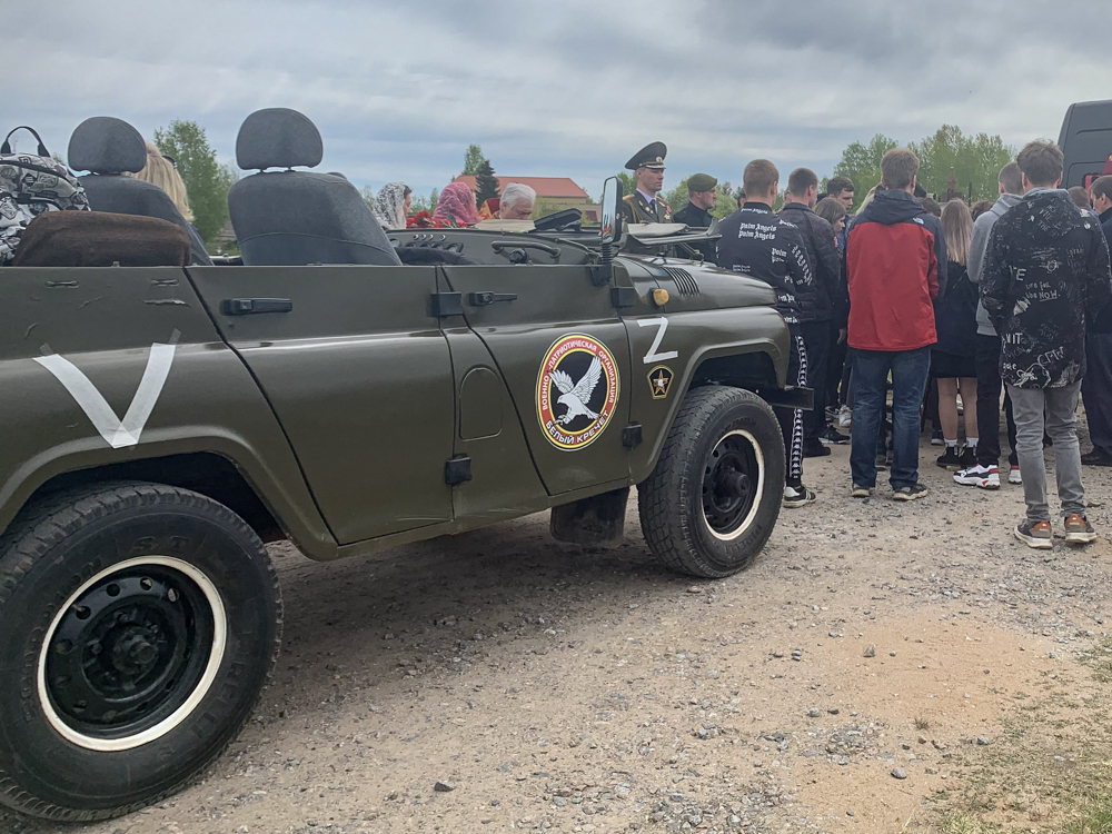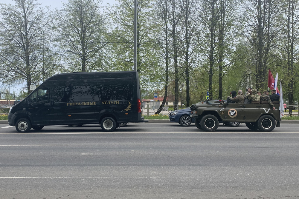 On the way to the cemetery, a military UAZ off-road vehicle with an open top, the letters Z and V pasted on its sides and flying three flags, cruises behind the van carrying the coffin. In the car, among people in military uniform, sits the father of the deceased in civilian clothes, his face turned into the wind.