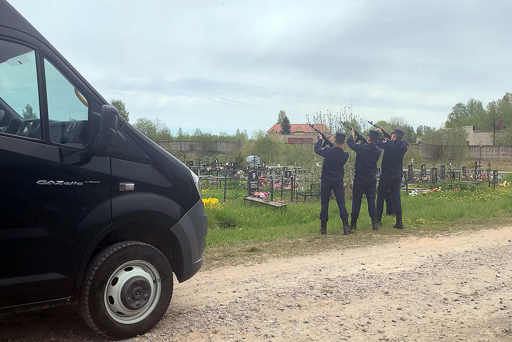 The burial rites end, the funeral march plays. The father of the deceased has come to his senses. He approaches the coffin again and hugs his wife. At this moment, everyone shudders as shots are fired. The honor guard is concealed from Yegorov’s relatives and friends by the funeral home van — no one expected the shots. People instinctively duck, and the father covers his ears with his hands.