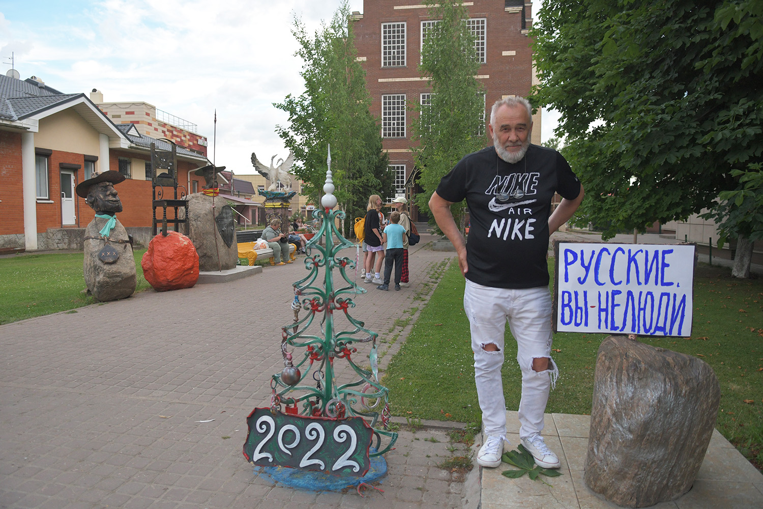 In front of the Dutch house Alexander made a public garden complete with benches and sculptures created by locals. A Dutch windmill neighbors a statue of storks and a head-shaped boulder with a smoking pipe, dressed in a top hat. Atop of the hat stands a crazy-eyed human figure holding a vodka bottle. The tiny man has the words “Crimea is ours” on his stomach. Attached to the hat itself is an iron plaque that reads “No to war”; the inscription is painted over. Alexander explains that the statue was made in 2014 when the Yabloko Party protested against war in Ukraine. Recently someone painted a Z sign on the plaque; Pravdin wiped it off.