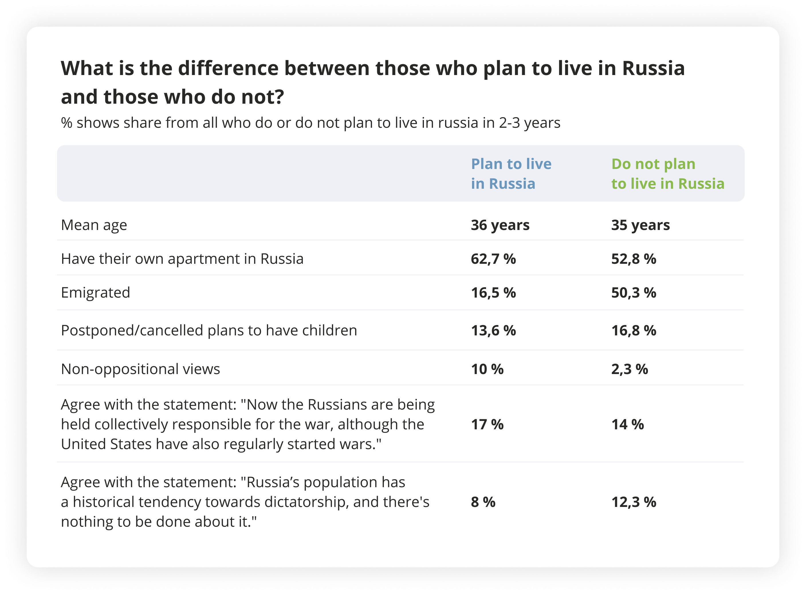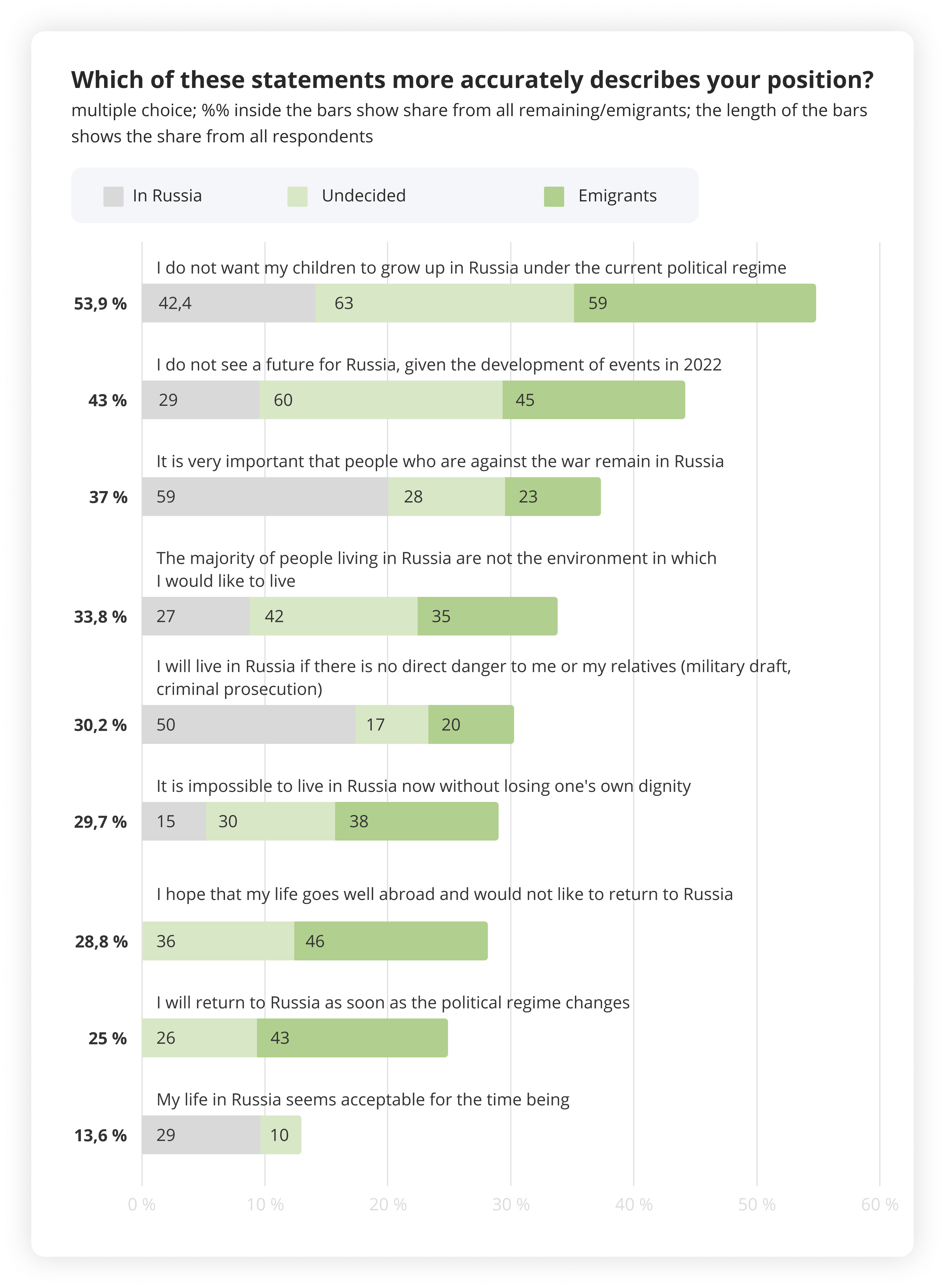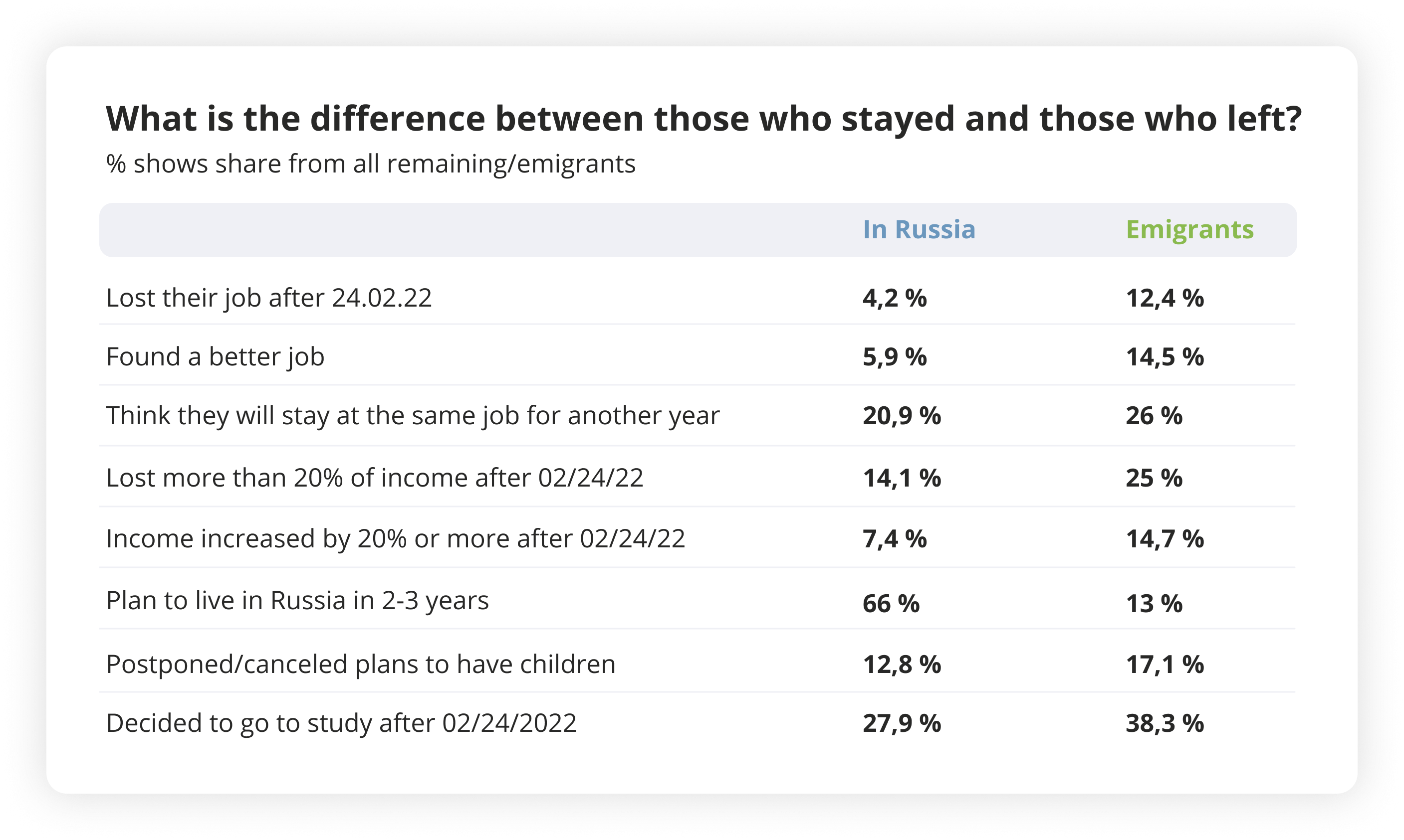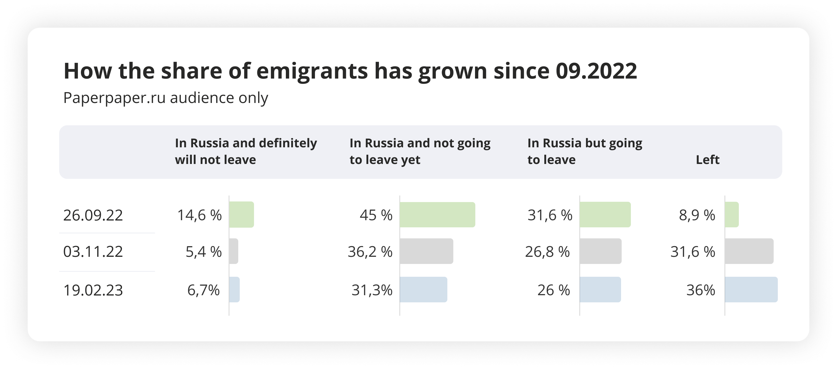 • “Results of the survey among Paperpaper.ru readers and other independent media are, of course, insufficient to draw conclusions about all those who have left and the entire population of Russia. However, these are very important data reflecting the moods and plans of a well-educated and opposition-minded audience. These data show us some very important nuances in the attitudes of those who have stayed and those who have left.