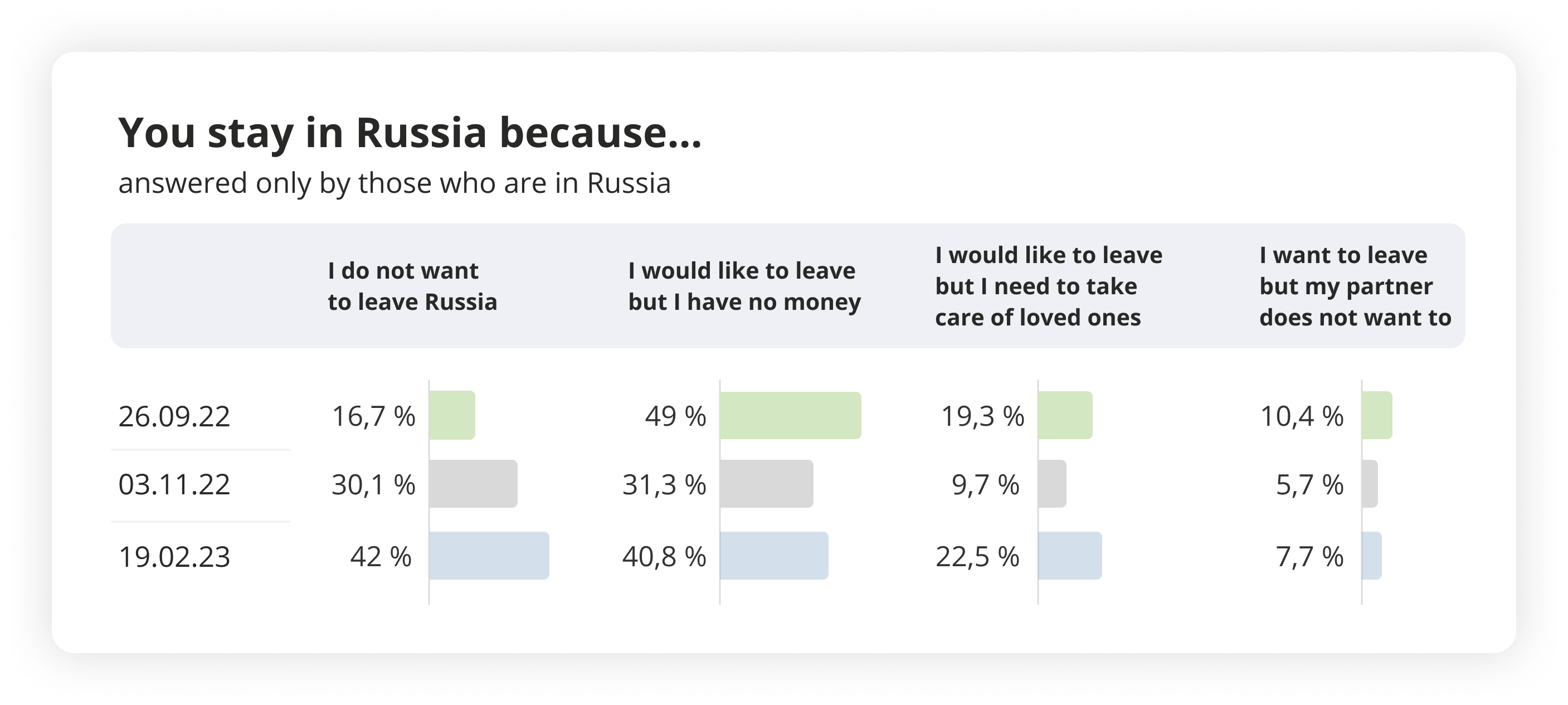 An impressive proportion, 42%, answered that they have no desire to leave. Moreover, in recent months, the number of such people has increased among those who remained. Presumably, some of those who previously wanted to but could not leave have since found an opportunity to do so, and now it is those who consciously want to stay in Russia has become larger.