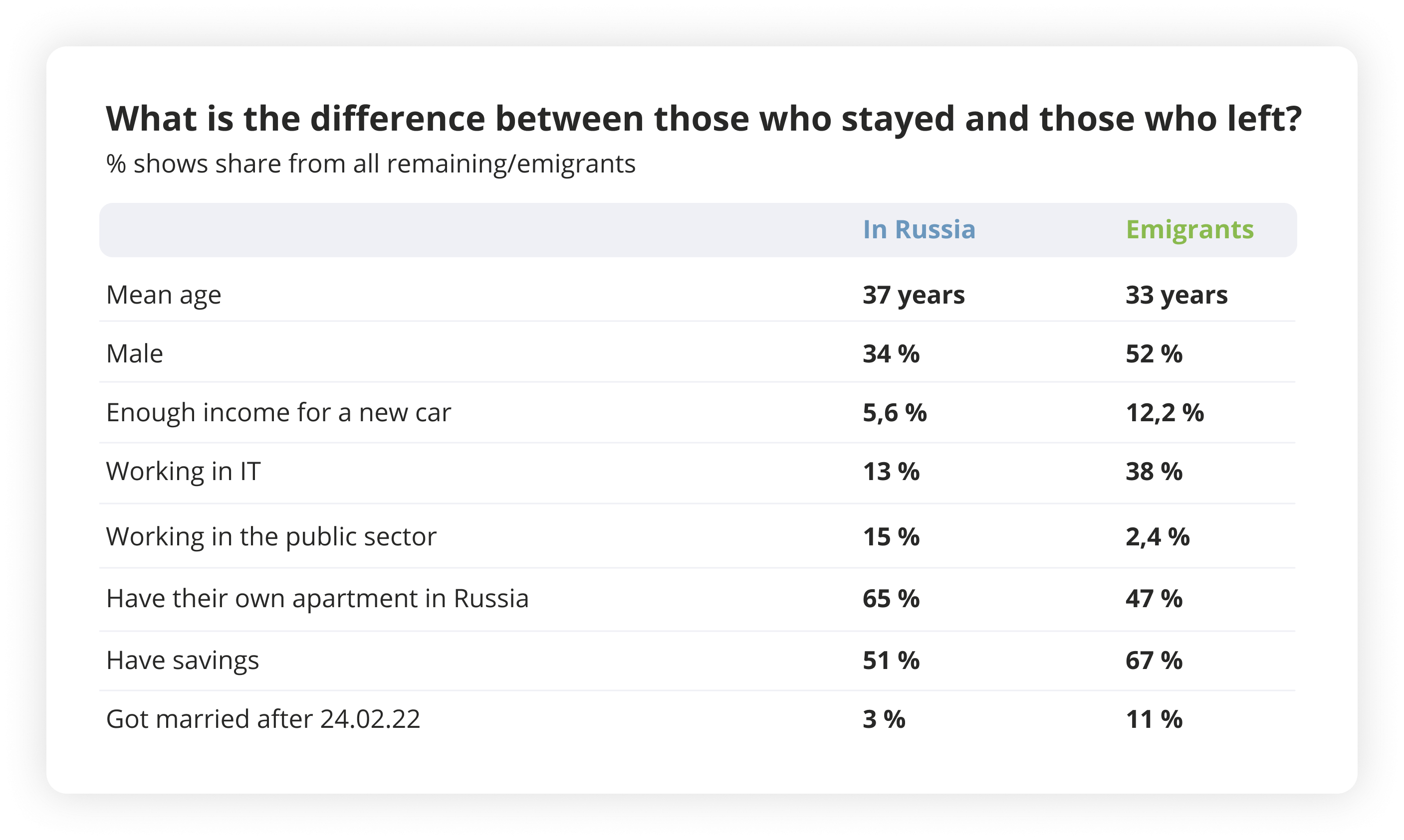 Among those who stayed, there is a higher proportion of public sector workers. “This indirectly indicates a loyal middle class whose income depends on the state,” explains Zavadskaia. In addition, an important characteristic of those who stayed is owning an apartment in Russia: 65% of those who did not leave own accommodation, compared to just 47% of emigrants.