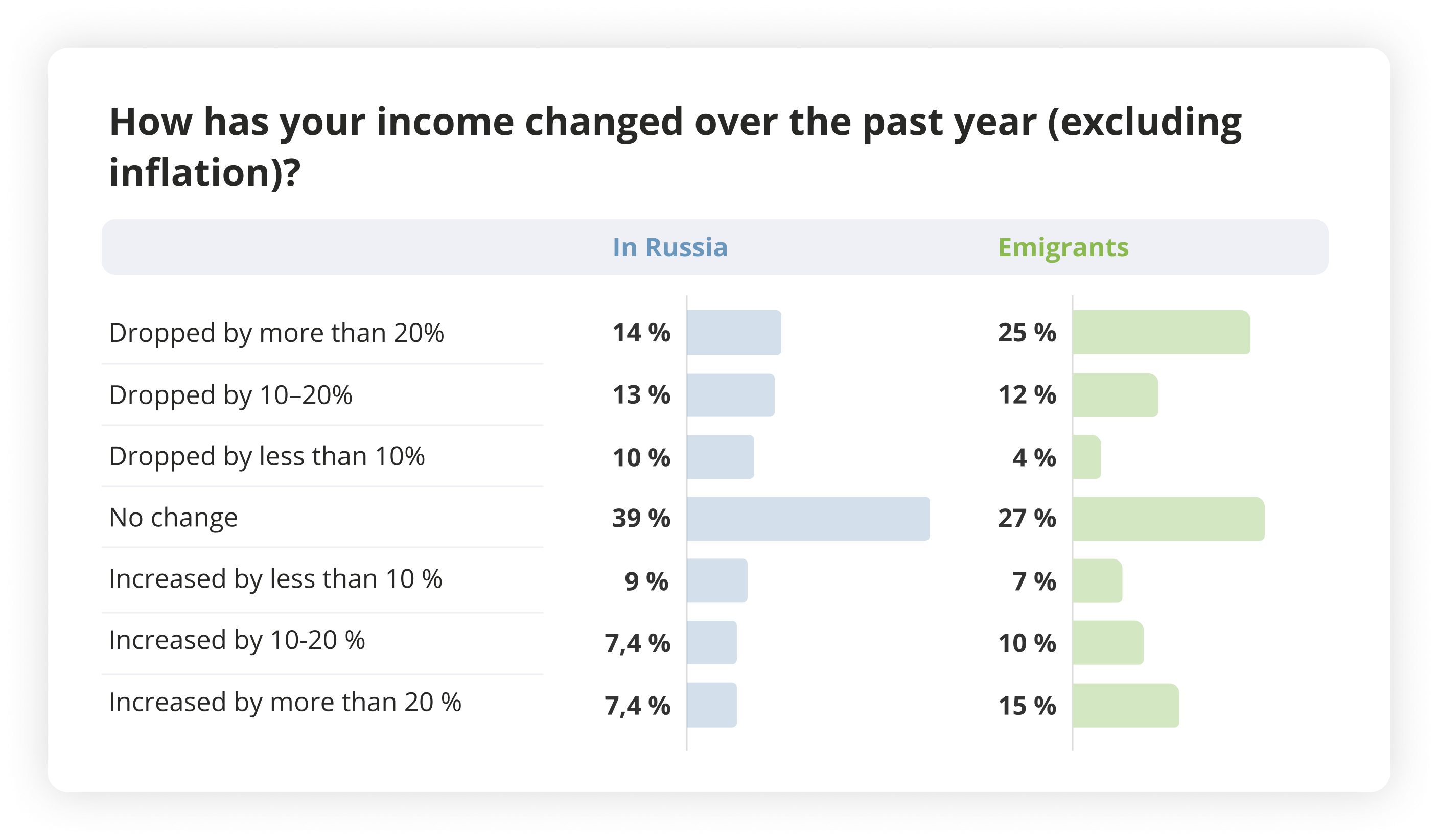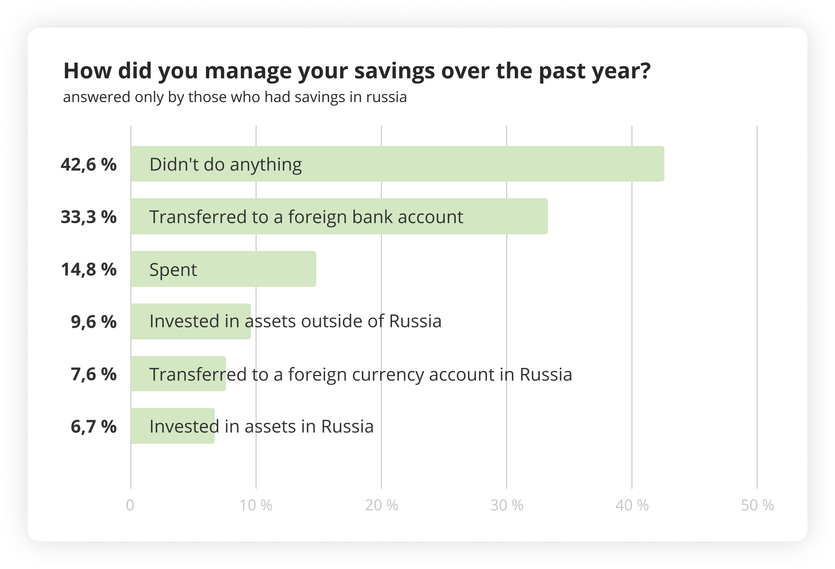 57% of respondents reported having savings. Of those, one-third transferred their money to a foreign bank account, and one-tenth invested in real estate or other assets abroad. 7% of those readers who had money invested it in Russian assets. Of those who invested in Russia, only two-thirds plan to live there in 2-3 years.