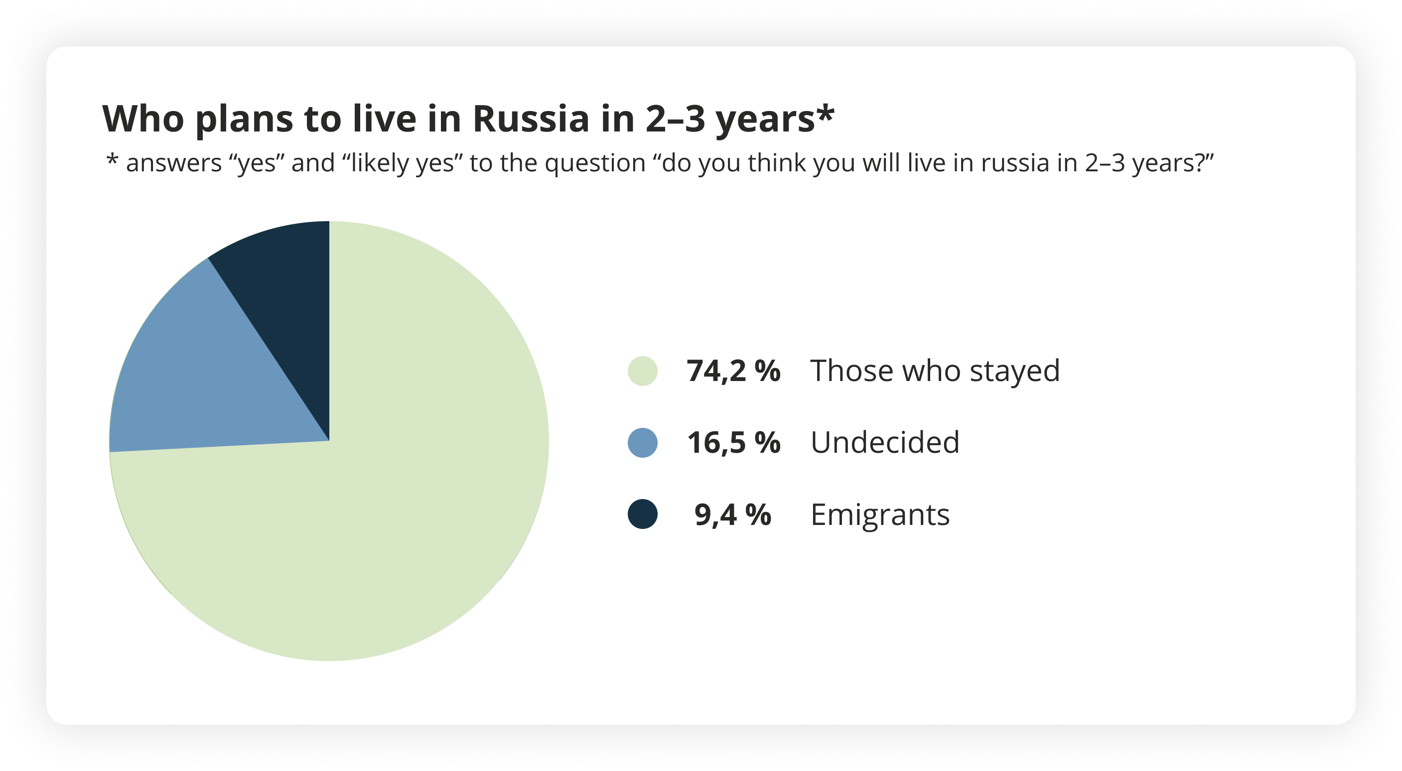 We calculated the share of those who stayed, those who are undecided, and those who emigrated, among the respondents who associate their future with Russia. It turned out that three-quarters of this group are made up of those who continue to live in Russia now.