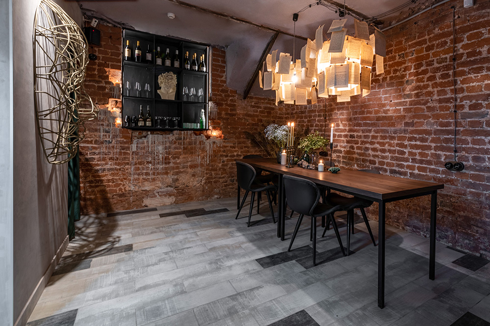 Необистро заняло небольшое помещение на цокольном этаже жилого дома начала XX века — два зала на 20–25 посадочных мест оформили в темных тонах с использованием сухоцветов, свечей и приглушенного освещения. Зеркала состарили, а люстры в первом зале сделали из папье-маше. Дизайн люстры во втором зале еще интереснее — светильник выполнили из страниц книги Михаила Салтыкова-Щедрина.