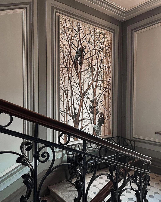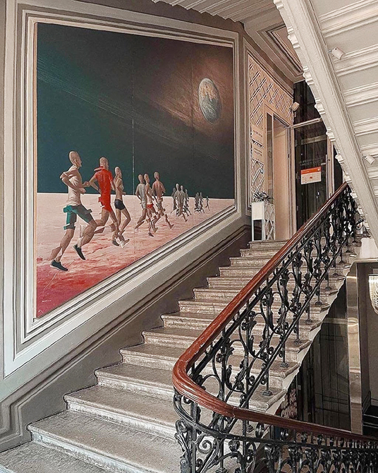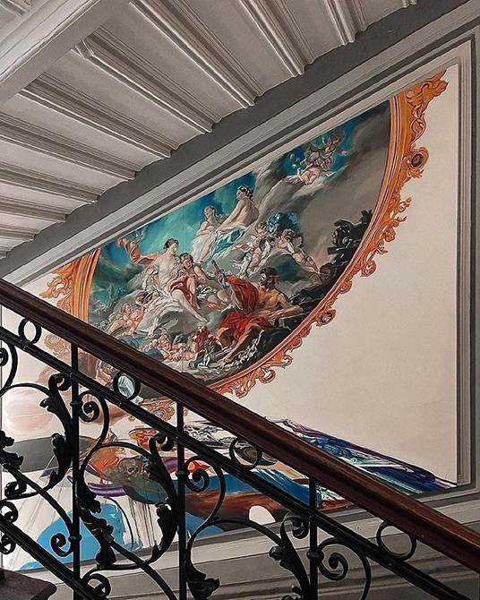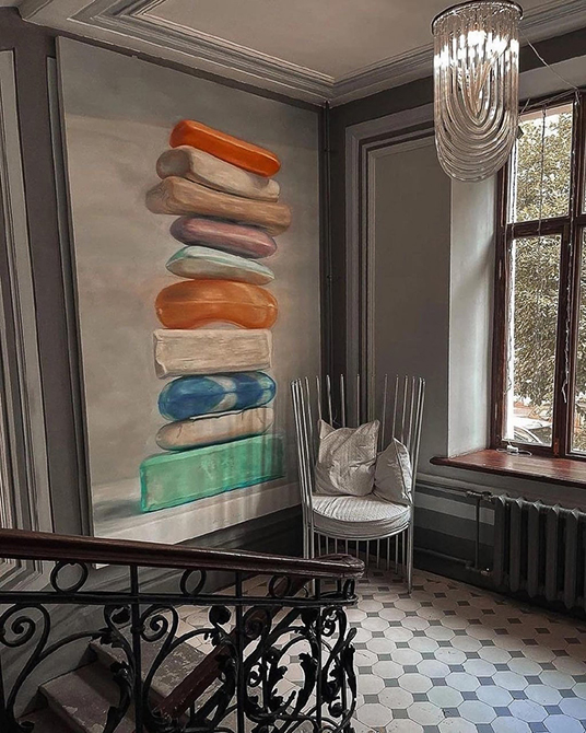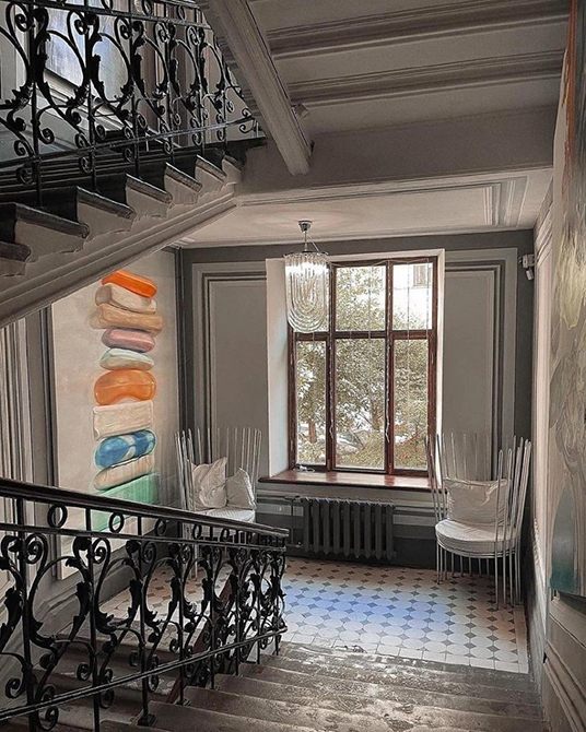 Но главное — пролеты украшают работы художников в стиле Кандинского, Дейнеки и современных авторов, а ренессансный сюжет выполнен в духе абстрактного экспрессионизма. В здании находится коворкинг «Ясная поляна», так что осмотреть парадную можно не тревожа жильцов.