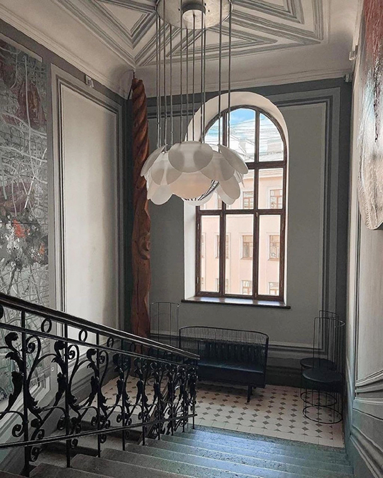 В пятиэтажном особняке на площади Льва Толстого есть эффектная открытая парадная. Это практически филиал музея эклектики: кованые перила, лепнина и деревянные двери здесь соседствуют с дизайнерской мебелью и освещением.