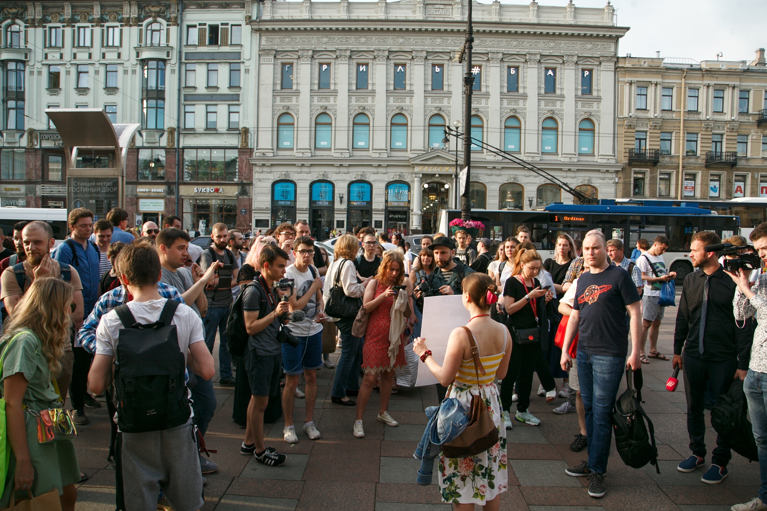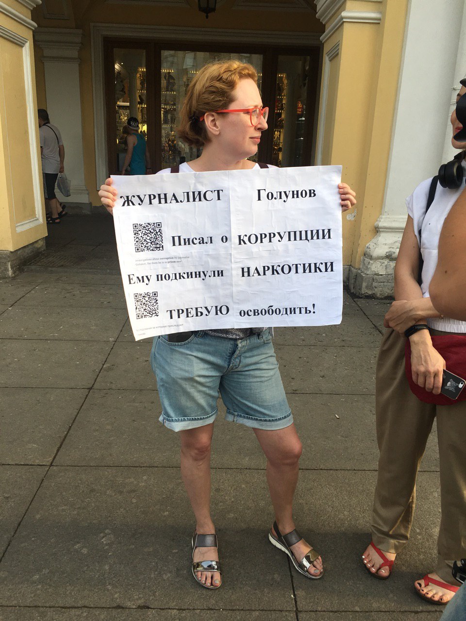 В Петербурге в одиночных пикетах по очереди стояли около 20 журналистов, в том числе сотрудники «Эха Москвы» Арсений Веснин, Иван Штейнерт и Татьяна Фельгенгауэр, журналист «Фонтанки» Денис Коротков, бывший главред «Агентства бизнес-новостей» Василий Романов и сотрудница издания «Собака.ru» Ксения Морозова.