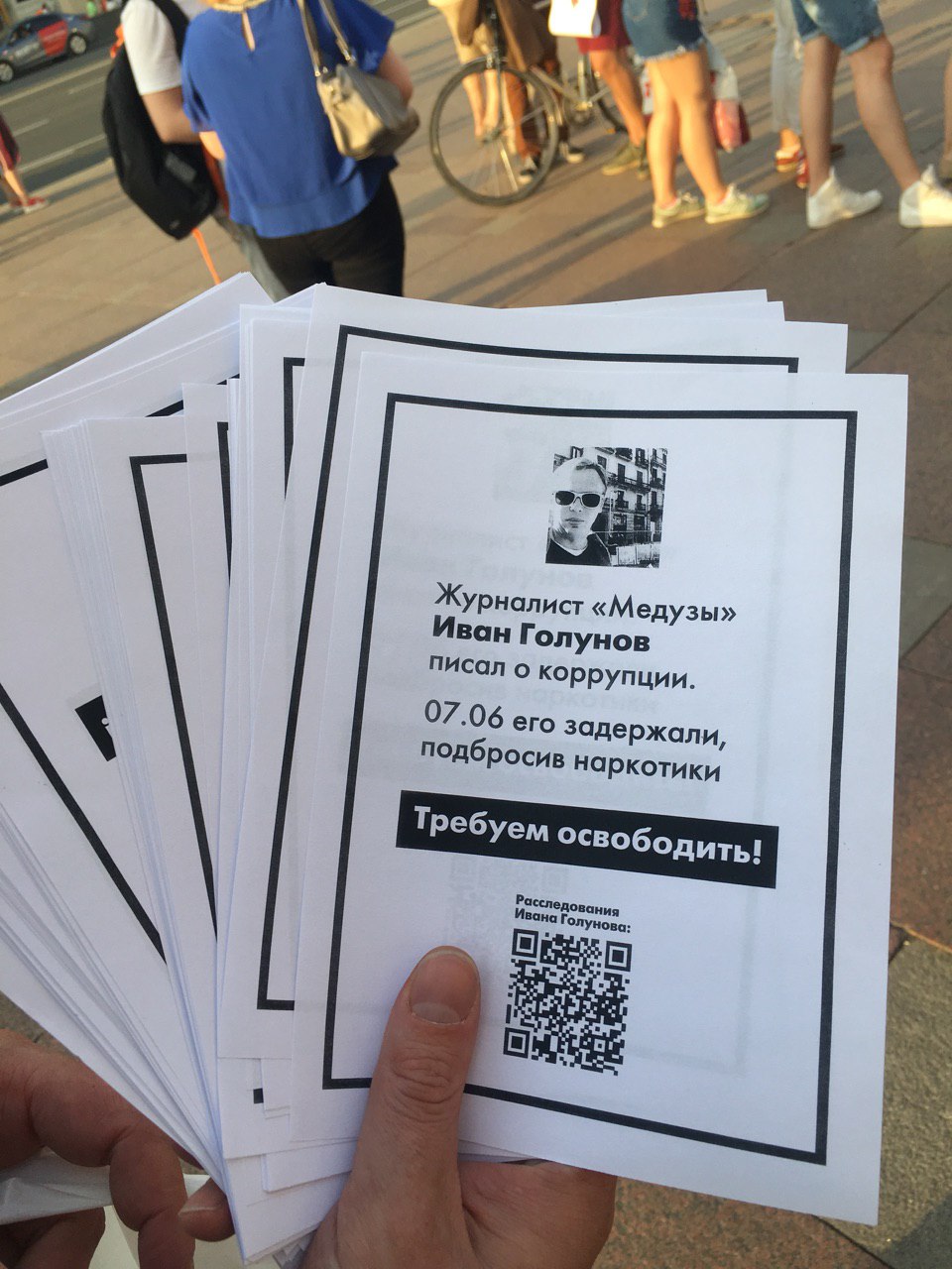 В Петербурге и Москве участники акций раздавали листовки с qr-кодом, при переходе по которому можно прочитать расследования Ивана Голунова. Участники петербургских пикетов рассказали «Бумаге», что в типографии сначала не хотели печатать листовки, назвав их агитационными материалами, однако проблему удалось решить.
