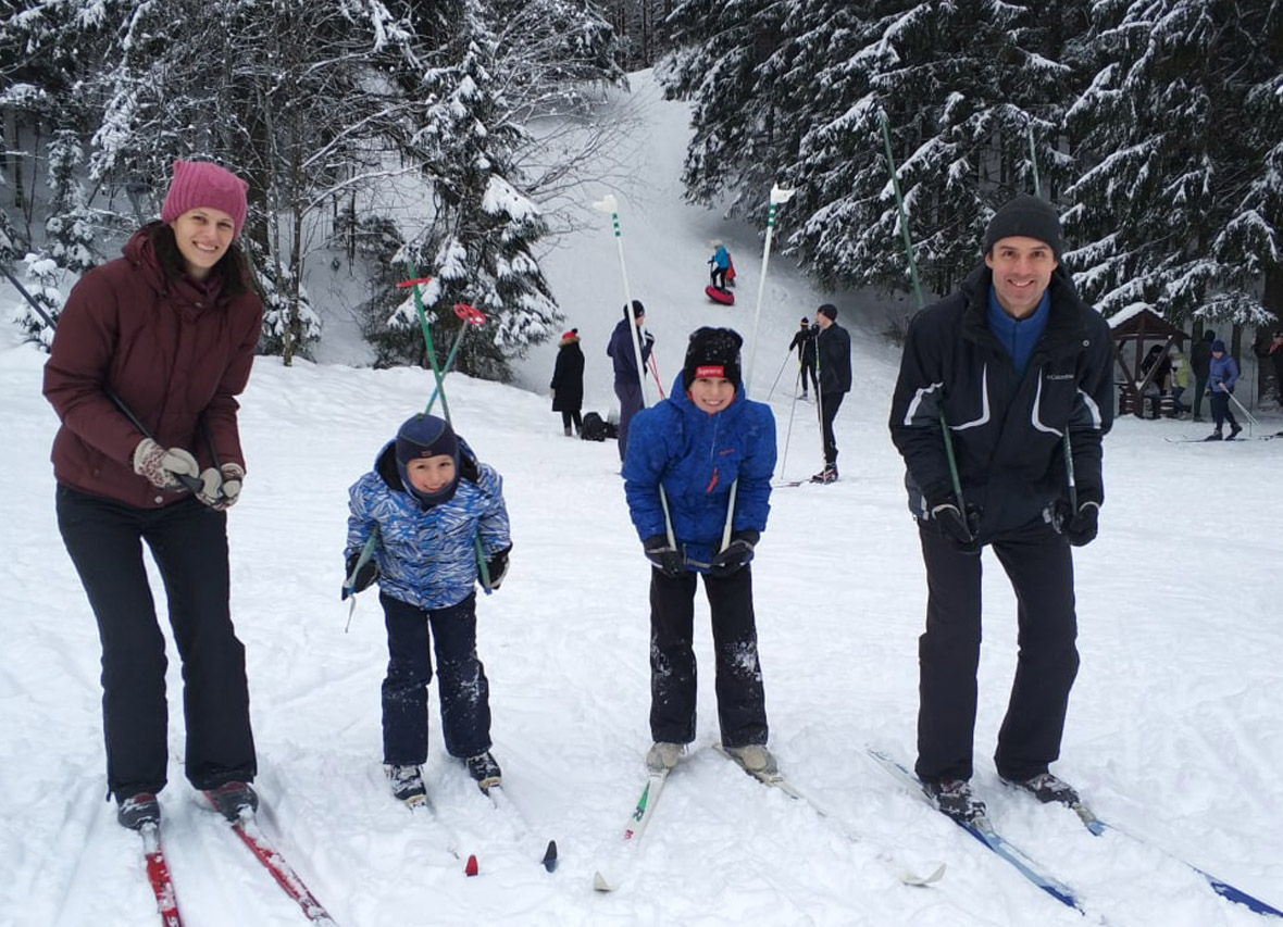 Мы стараемся всё делать вместе с детьми. Они часто соглашаются поиграть вместе в волейбол или футбол, побегать на перегонки. А если я выхожу с велосипедом, то едем всей семьей. Зимой берем лыжи напрокат и катаемся вместе по парку.