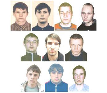Согласно приговору, первое преступление группа совершила 9 августа 2003 года в поселке Никольское. Скинхеды напали на граждан Армении Маквела Эламиряна и Лиану Туманян. 12 октября у дома 116 по улице Танкиста Хрустицкого Дмитрий Ерофеев с Воеводиным попытались убить нигерийца Омордиона Лавренсе, когда тот шел с двумя чернокожими знакомыми. Ерофеев, вооруженный обрезком трубы, напал на мужчин. Знакомые Лавренсе смогли сбежать, ему самому повезло меньше, его больше 30 раз пырнули ножом. Нигериец чудом не умер — вовремя приехала скорая.