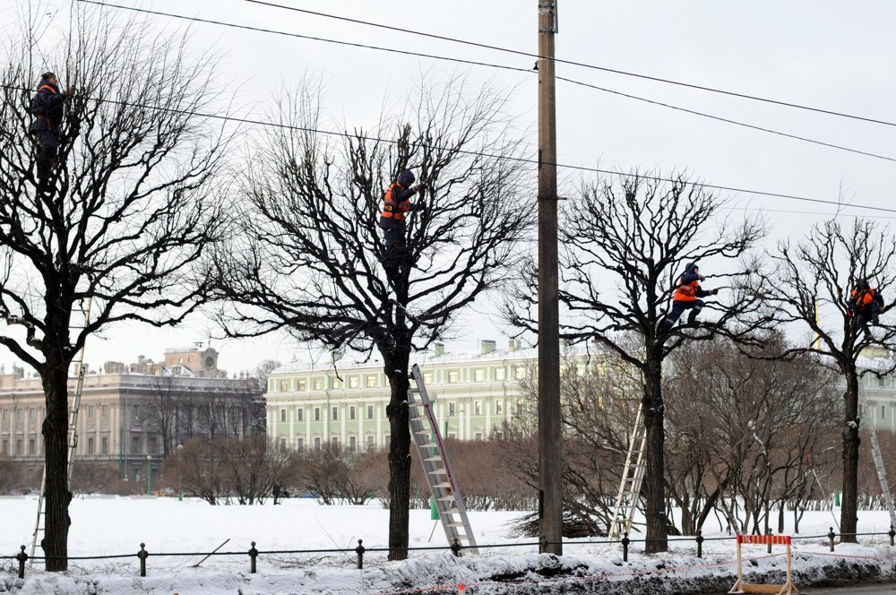 Петербургские вариации на тему картины Саврасова: работники садово-паркового хозяйства ровняют кроны лип по периметру Марсова поля. Это обычные работы зимой и ранней весной: до появления почек с деревьев срезают сухие и поврежденные ветви и придают кронам красивую округлую форму.