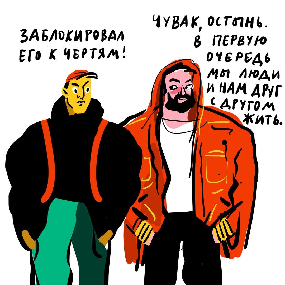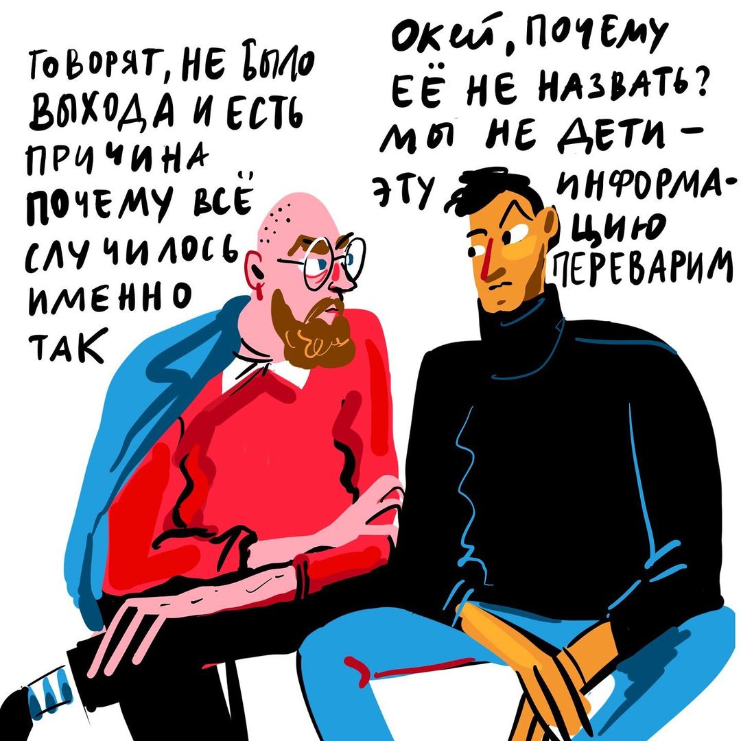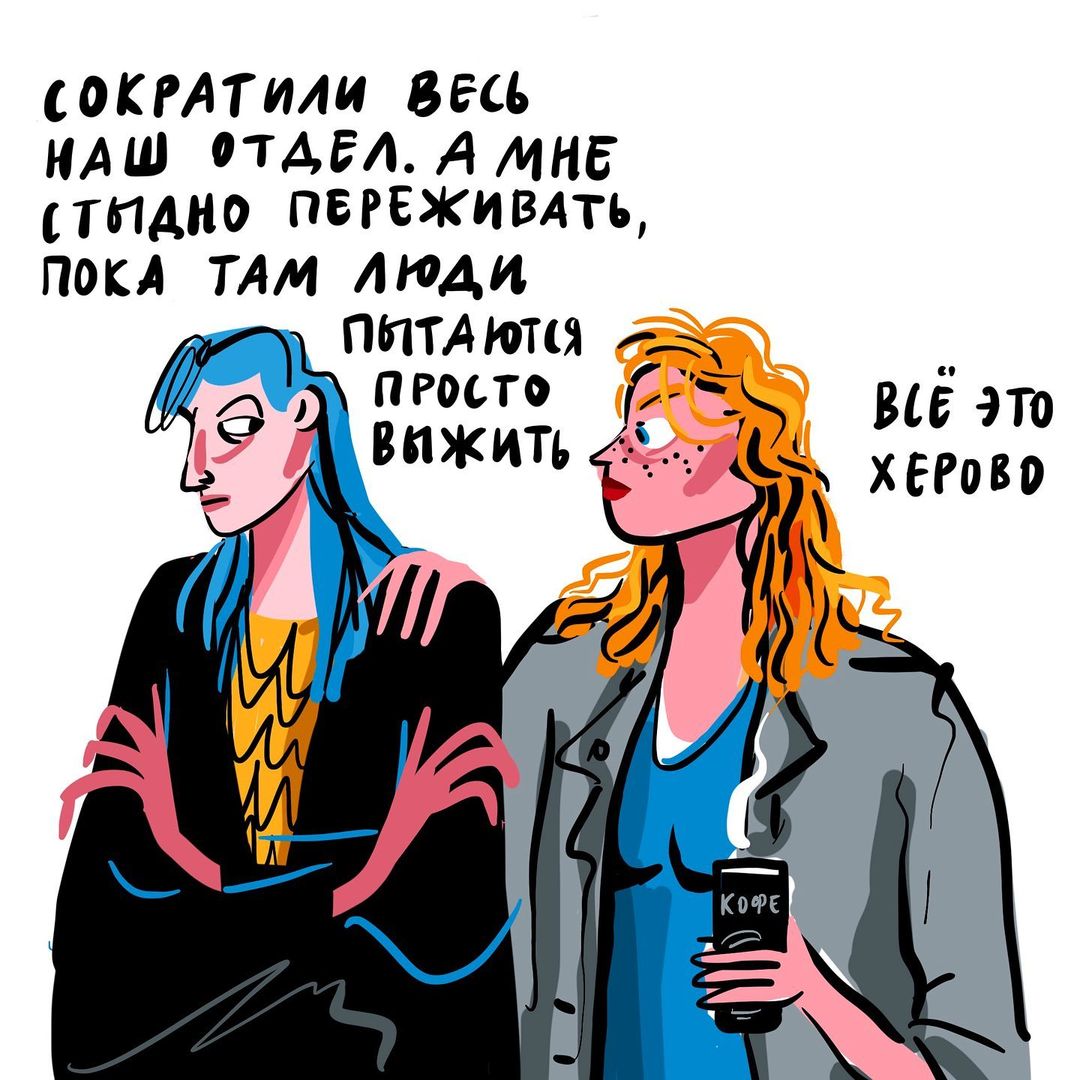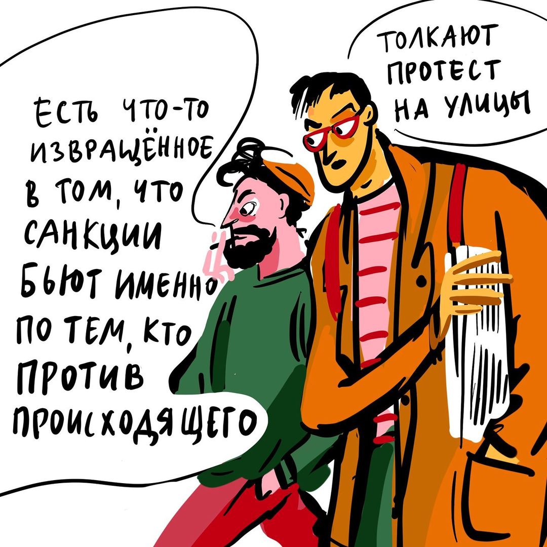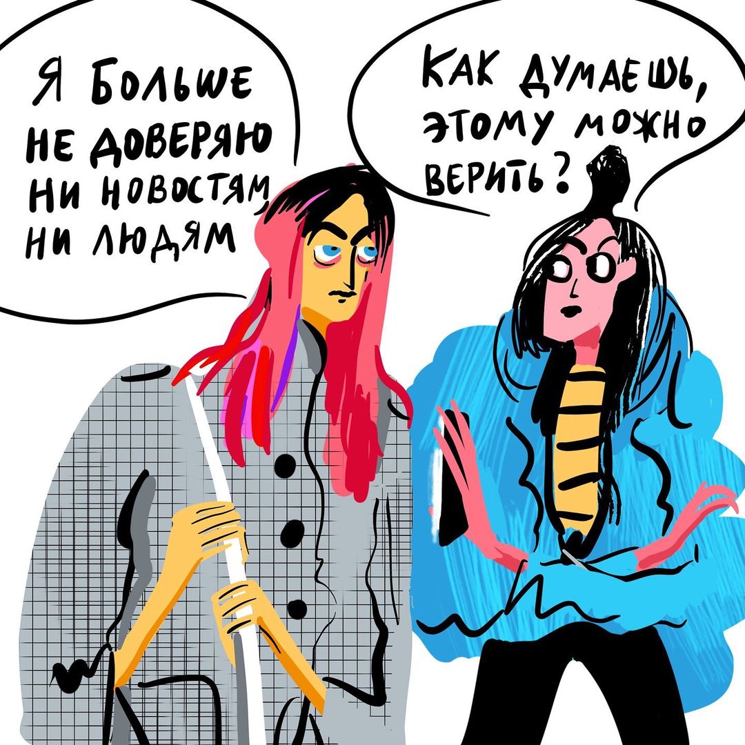Московская художница, публикующая свои работы под ником evdokeya, создала серию иллюстраций, подслушав на улице разговоры о ситуации в Украине. «Бумага» показывает ее рисунки под общим названием «Хроники конца марта».