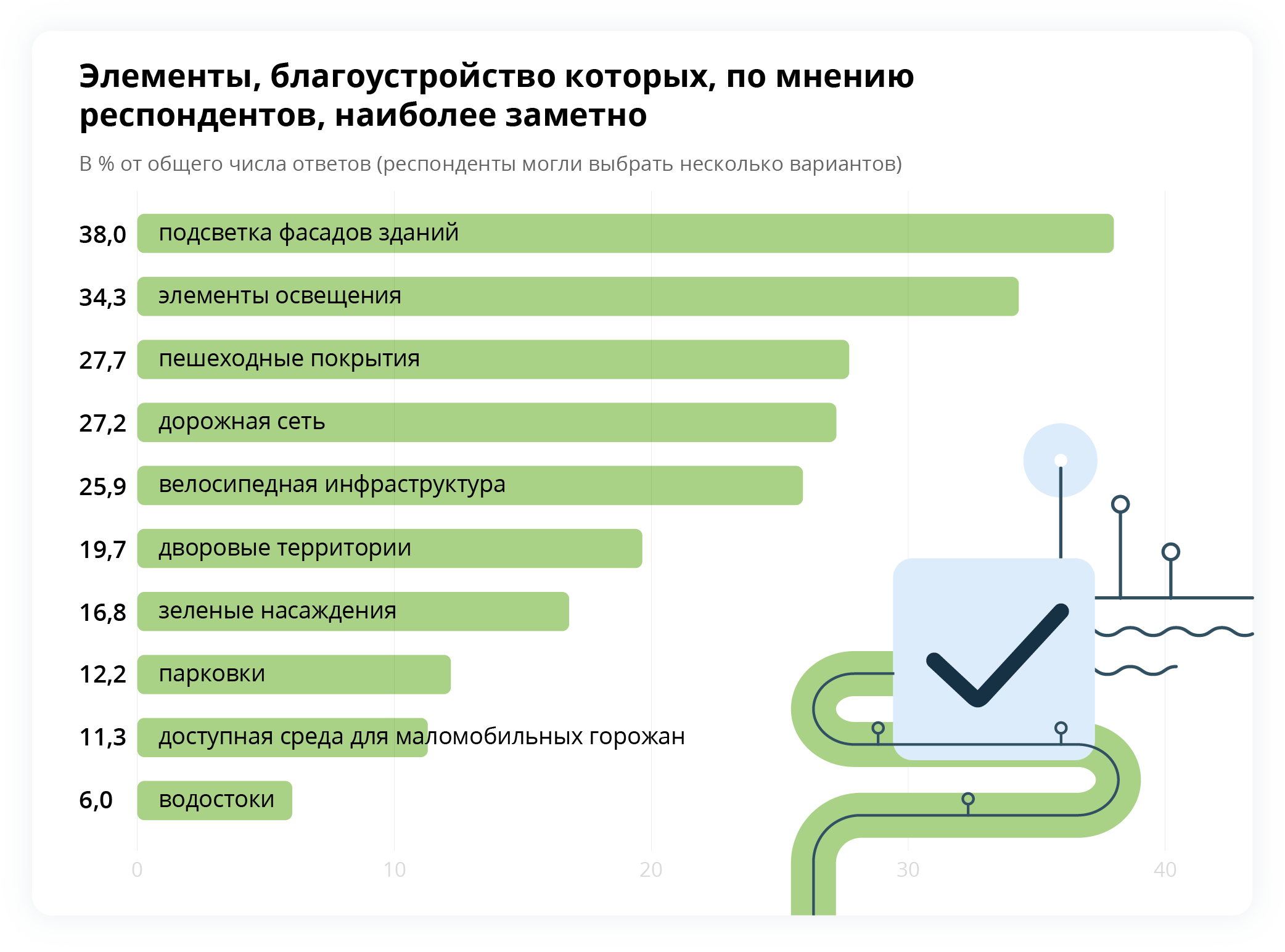 Самыми заметными элементами благоустройства участники опроса считают подсветку фасадов зданий, городское освещение и пешеходные покрытия. Положительно респонденты относятся также к благоустройству набережных, парков, ремонту фасадов, ликвидации ларьков и улучшению работы общественного транспорта.