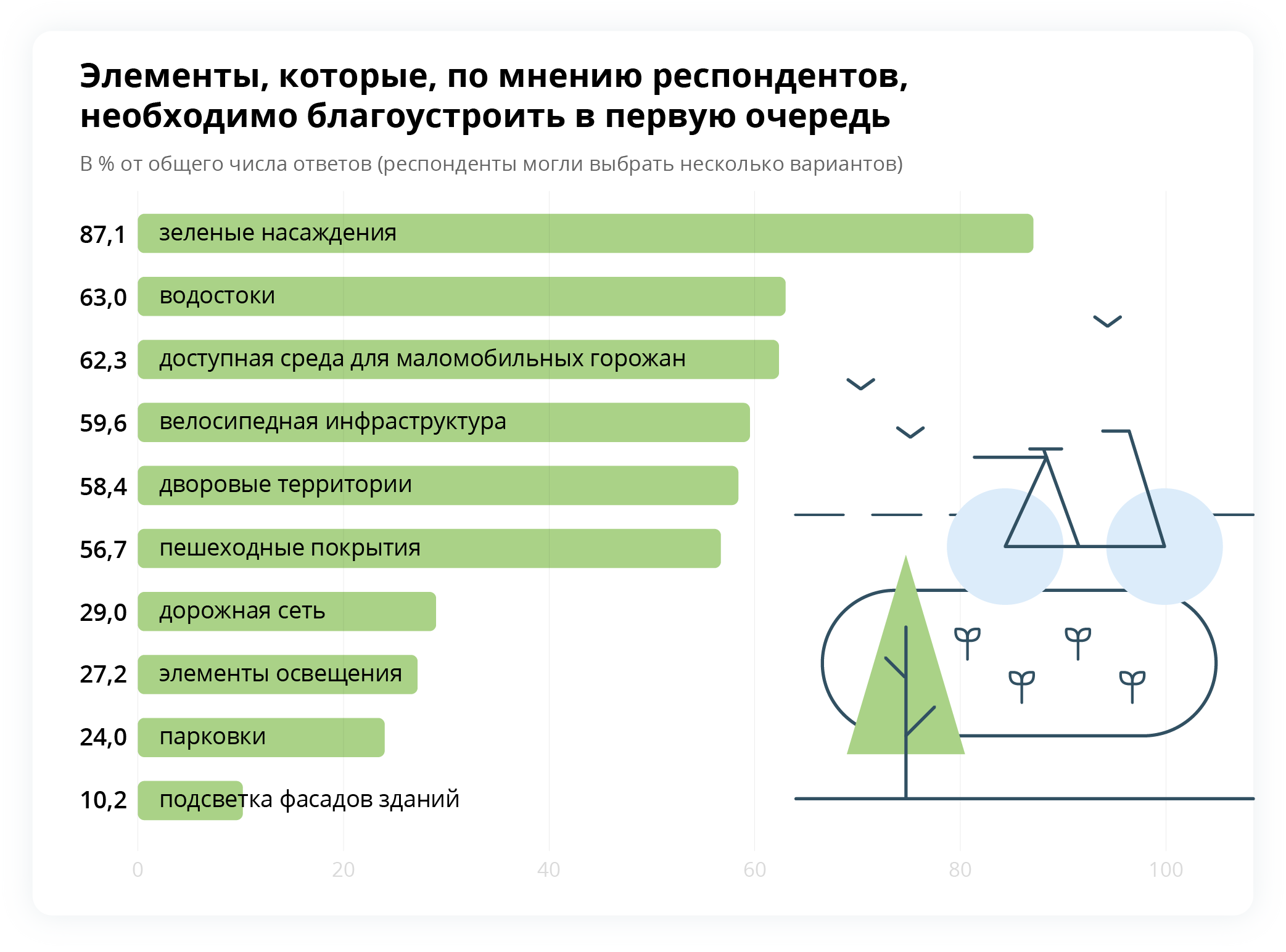 Главный запрос со стороны жителей — озеленение города. Подавляющее большинство — 97 % — высказались за создание зеленых зон.