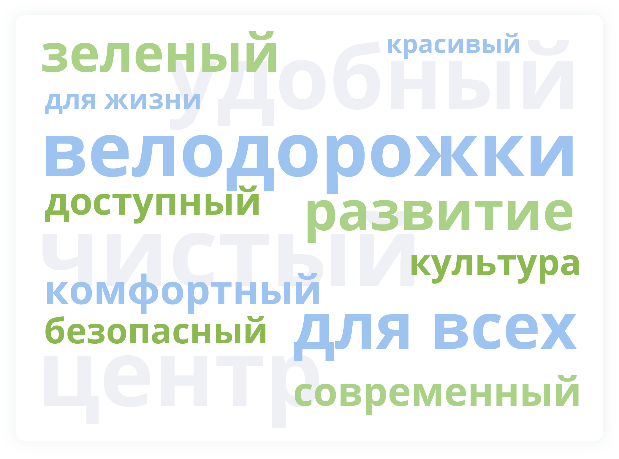 Для создания образа Петербурга будущего отдел исследований использовал инструмент «облако слов». На основе ответов участников опроса получился образ зеленого, чистого, удобного города, комфортного для пешеходов и маломобильных жителей, с велодорожками и развитой транспортной инфраструктурой.