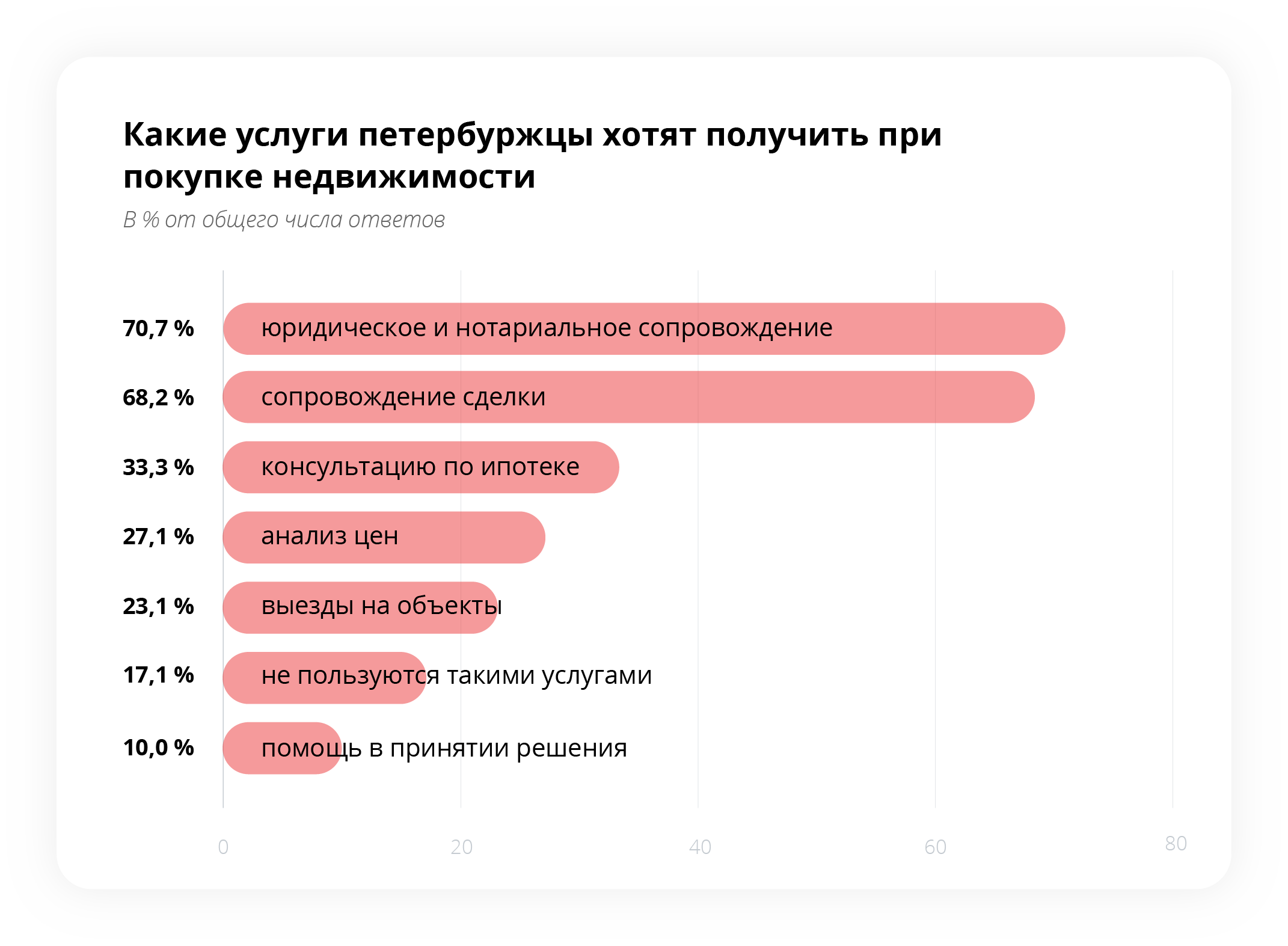 В числе услуг, которые петербуржцы хотели бы получить при приобретении недвижимости, чаще всего встречаются юридическое и нотариальное сопровождение и помощь в проведении сделки на всех этапах.