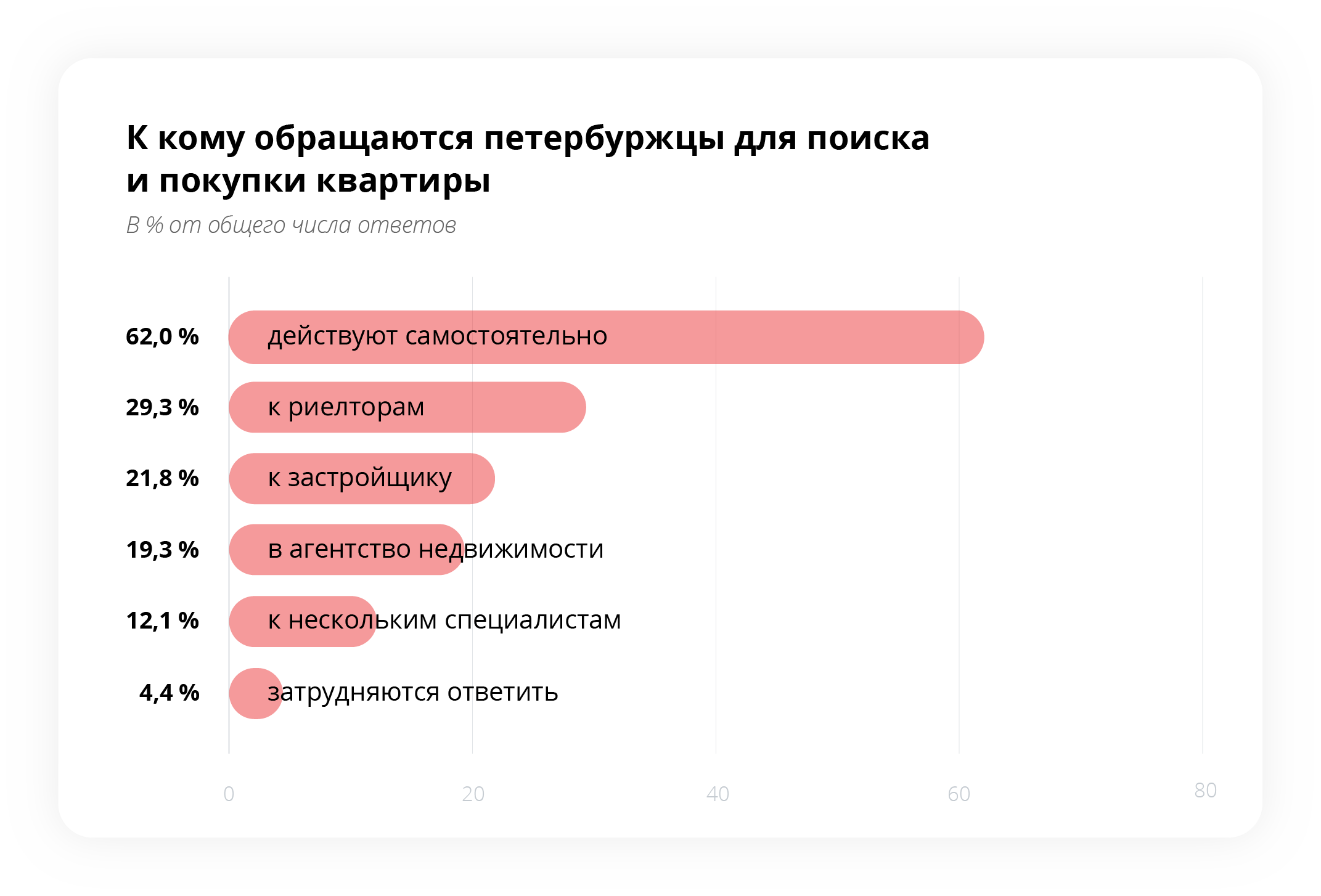 Петербуржцы склонны покупать квартиры самостоятельно, но нередко прибегают к помощи риелтора или обращаются в компанию застройщика или агентство недвижимости. Горожане указывают, что испытывают трудности с бюрократией и выбором недвижимости. Кроме того, опрошенные рассказывают о сложностях с выстраиванием и проведением сделки.