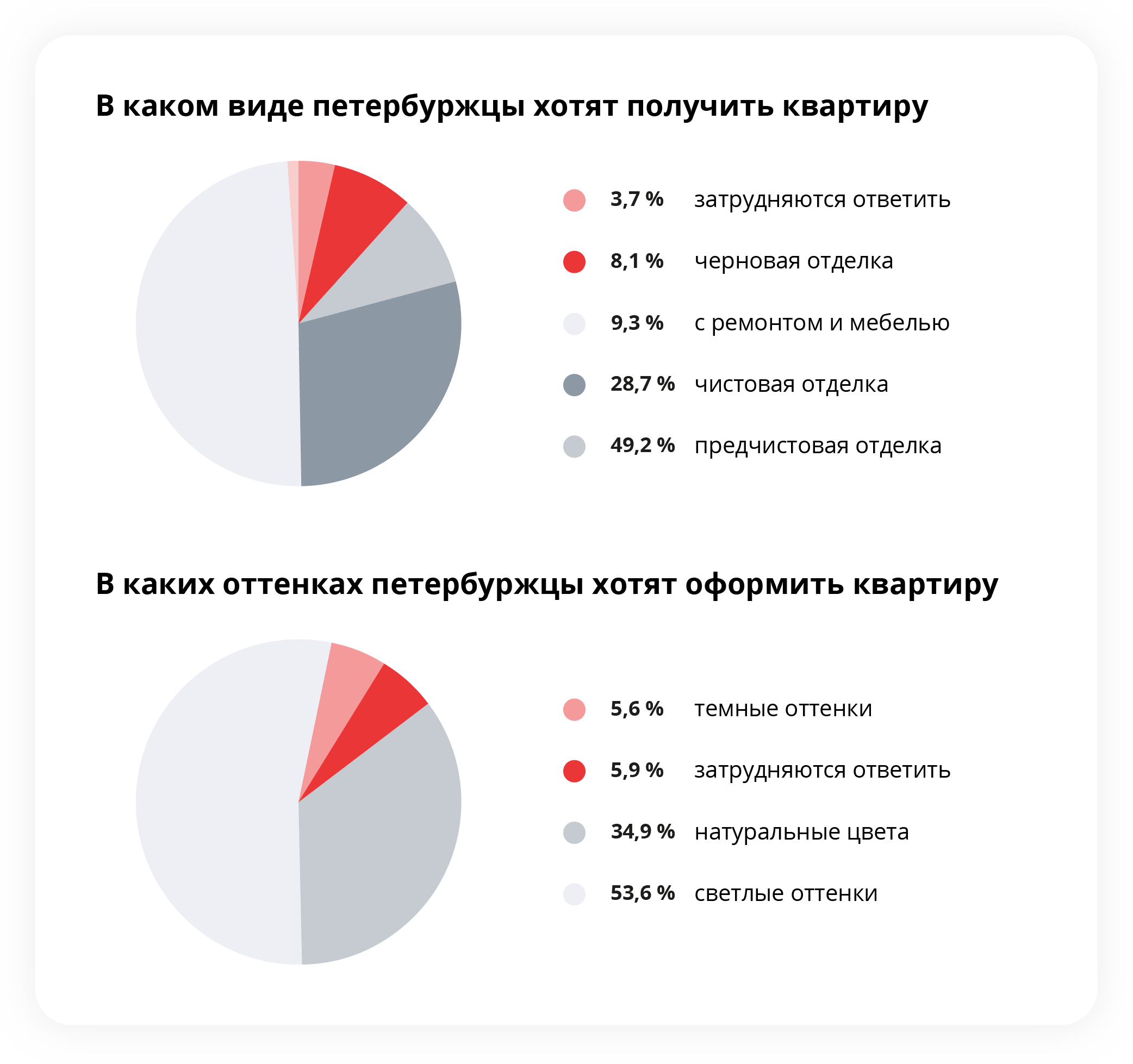 Почти половина опрошенных хотели бы приобрести квартиру с предчистовой отделкой, а около 30 % — с чистовой. Каждый десятый респондент предпочитает, чтобы его квартира была полностью готова и обставлена мебелью. Только 8 % петербуржцев решили, что лучше получить квартиру с черновой отделкой и сделать весь ремонт самостоятельно.
