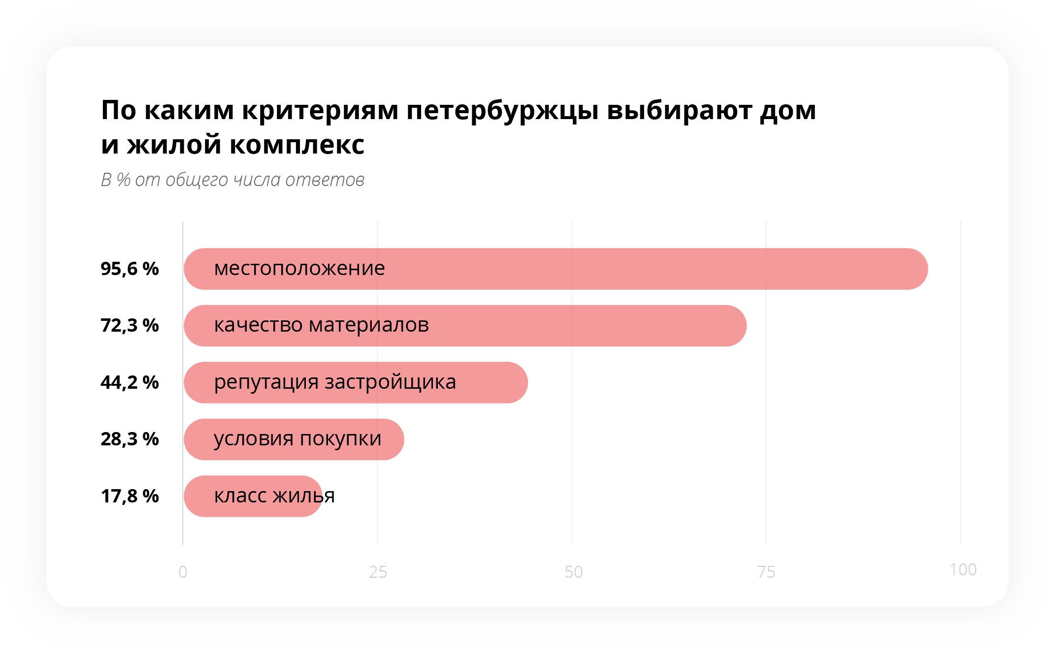 Около 96 % читателей выбирают дом или жилой комплекс на основе их месторасположения. Качество материалов, из которых построено здание, и его состояние имеют значение для 72 % опрошенных. Почти для половины респондентов важным критерием стала репутация застройщика.