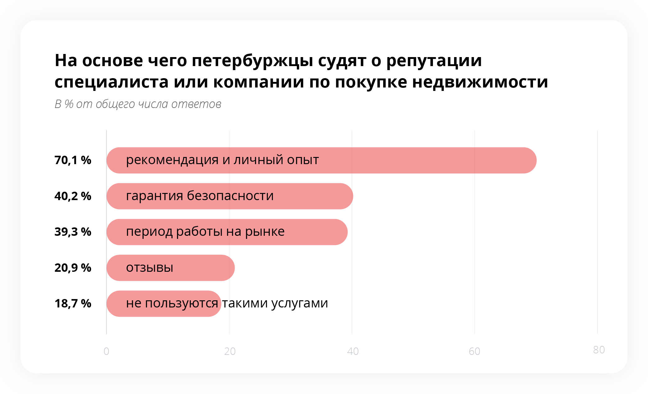 Почти три четверти опрошенных судят о репутации компании или специалиста на основе личной рекомендации или собственного опыта обращения к ним. Другие критерии, на которые читатели опираются в выборе фирмы или риелтора, — гарантия безопасности и длительная работа на рынке.