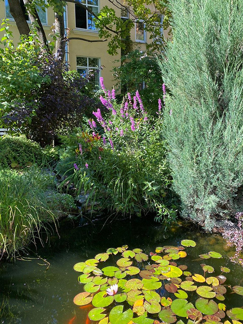 Последние пять лет я занимаюсь садом без помощников. Он хоть и небольшой, но с большим количеством растений. Есть крупномеры — старый клен, под сенью которого устроена зона отдыха, центр сада — можжевельник скальный вместе с приподнятым формальным прудом. В пруду живут рыбки и нимфеи (кувшинки — прим. «Бумаги»).