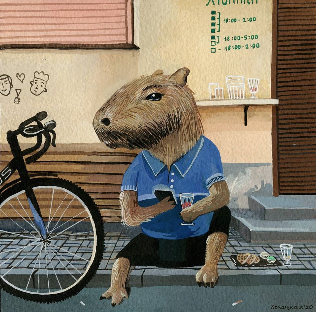 Художница Екатерина Хозацкая нарисовала открытку в поддержку маленьких заведений и призвала подписывать петицию против ужесточения запрета. На рисунке она изобразила капибару у бара «Хроники».