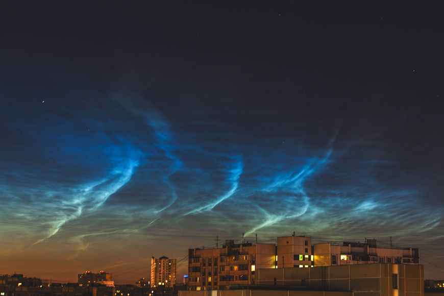 Это самые высокие облака на Земле, которые формируются в мезосфере на высоте 80 км, где температура ниже –120 °C. Их также называют «ночные светящиеся облака». Явление можно наблюдать с мая до конца августа и только в сумерках, когда Солнце опускается под горизонт на 6–16° — в это время кристаллы льда в мезосфере лучше всего подсвечиваются, а облака более низких слоев атмосферы находятся в тени. Серебристые облака очень хорошо видны как в Ленобласти, так и в городе.