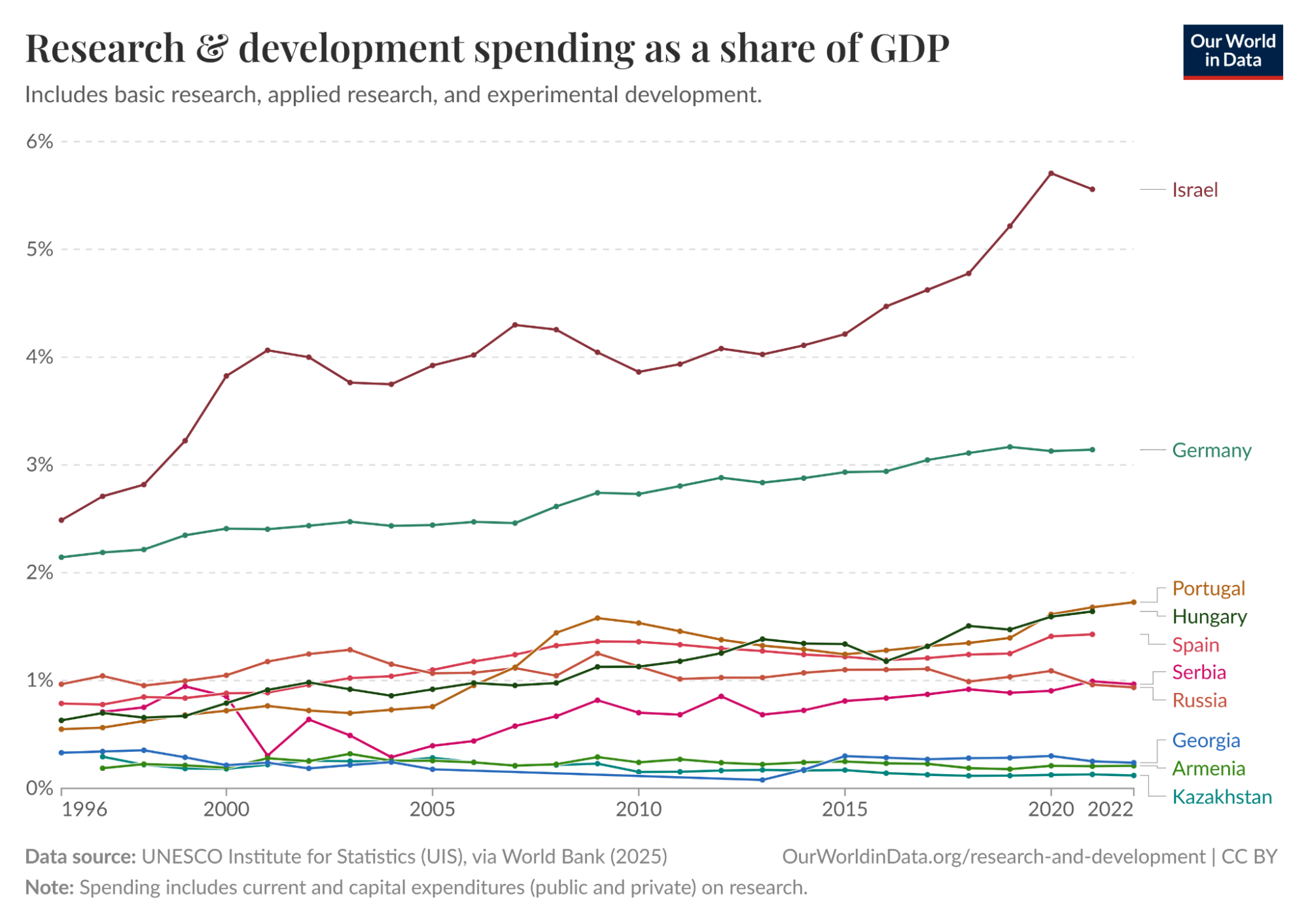 Доля ВВП, которая тратится на исследования и новые разработки в странах, которые популярны среди российских эмигрантов, данные за 1996–2022 год. Источник: ЮНЕСКО по данным Всемирного банка / Our World in Data