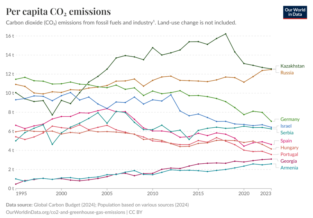 В самой верхней части графика объединились лидеры по выработке углекислого газа — Казахстан и Россия. А лучше всего с качеством воздуха дело обстоит на Кавказе — в Армении и Грузии, — и также в Португалии и как раз-таки Венгрии. Это показатель, который вы, скорее всего, заметите в повседневной жизни.