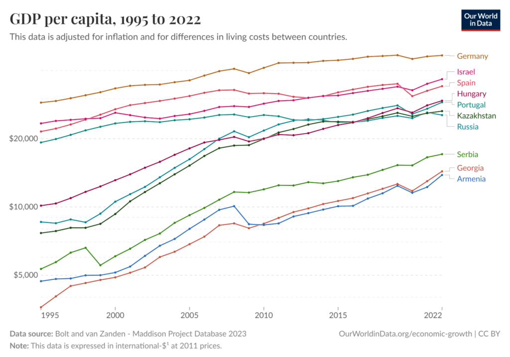 Из нашего списка по этому показателю Венгрия находится в одной точке с Португалией, чуть выше Казахстана и России — но совсем незначительно. Испания, Израиль и особенно Германия находятся выше, а вот Сербия (внезапно) и Грузия с Арменией — по уровню ВВП сильно ниже.