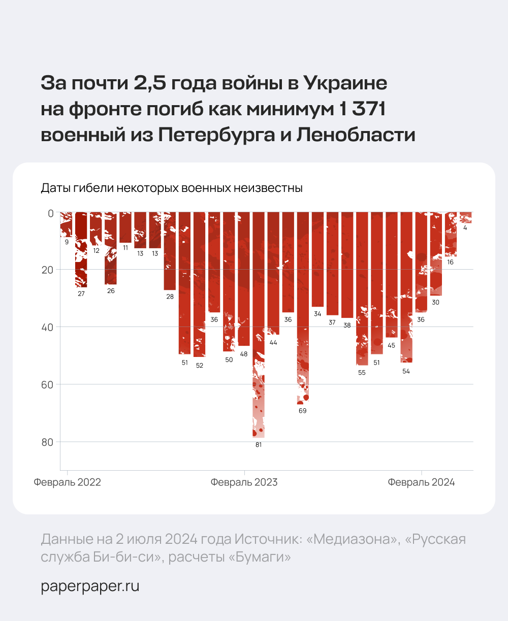 Журналисты «Медиазоны» и «Русской службы Би-би-си» подтвердили смерть 57 тысяч российских военнослужащих с начала полномасштабной войны в Украине до середины мая 2024-го. Минимум 1 371 погибший — петербуржцы и жители Ленинградской области, посчитала «Бумага».