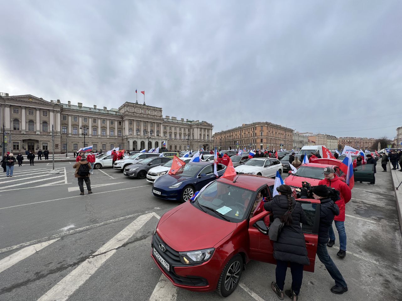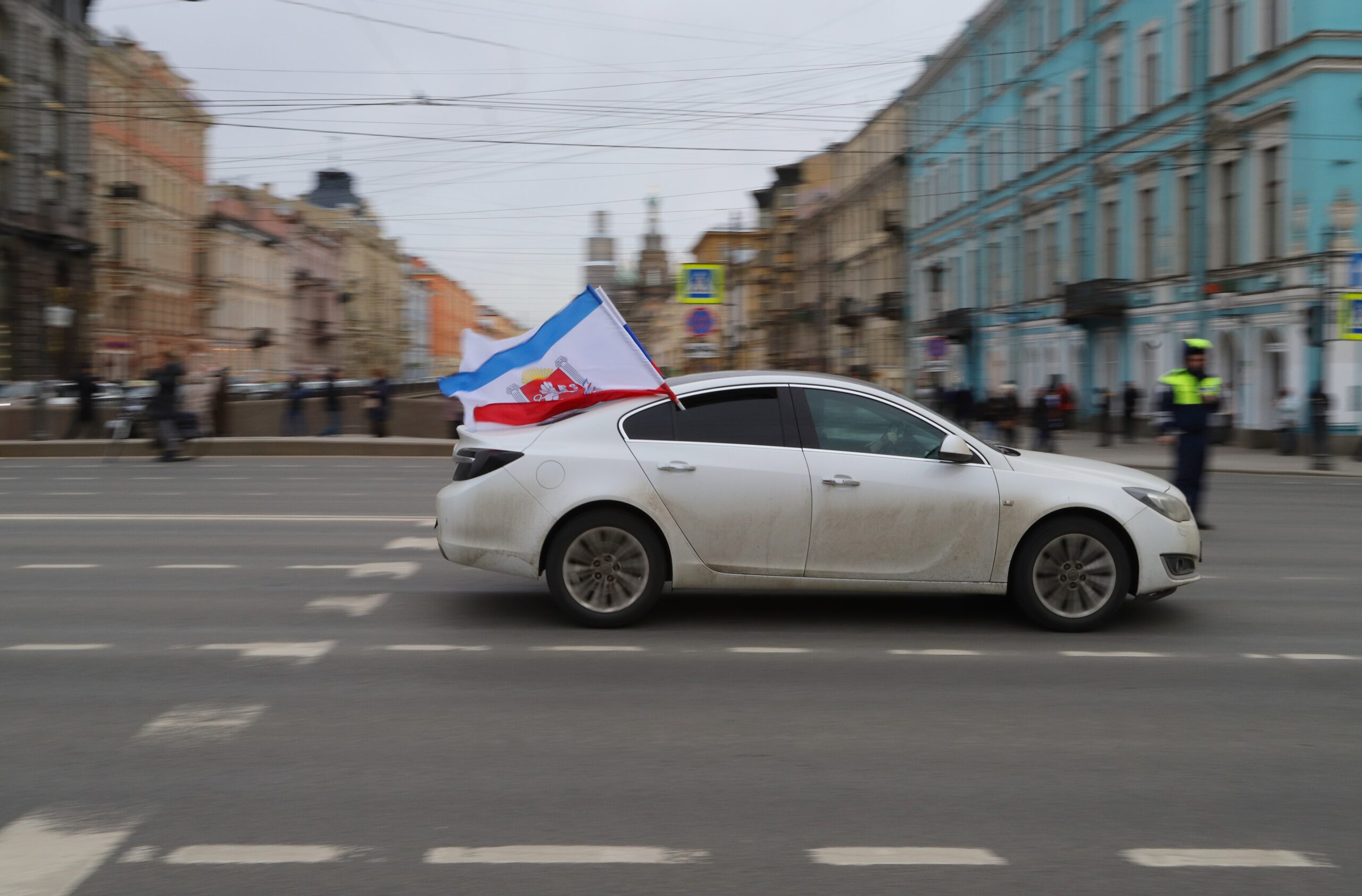 Празднование аннексии Крыма утром начали с автопробега «Волонтерской роты» — организации, которая платит студентам за участие в провоенных акциях и участники которой могли быть причастны к нападению на петербургского журналиста Петра Иванова.