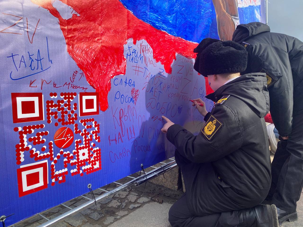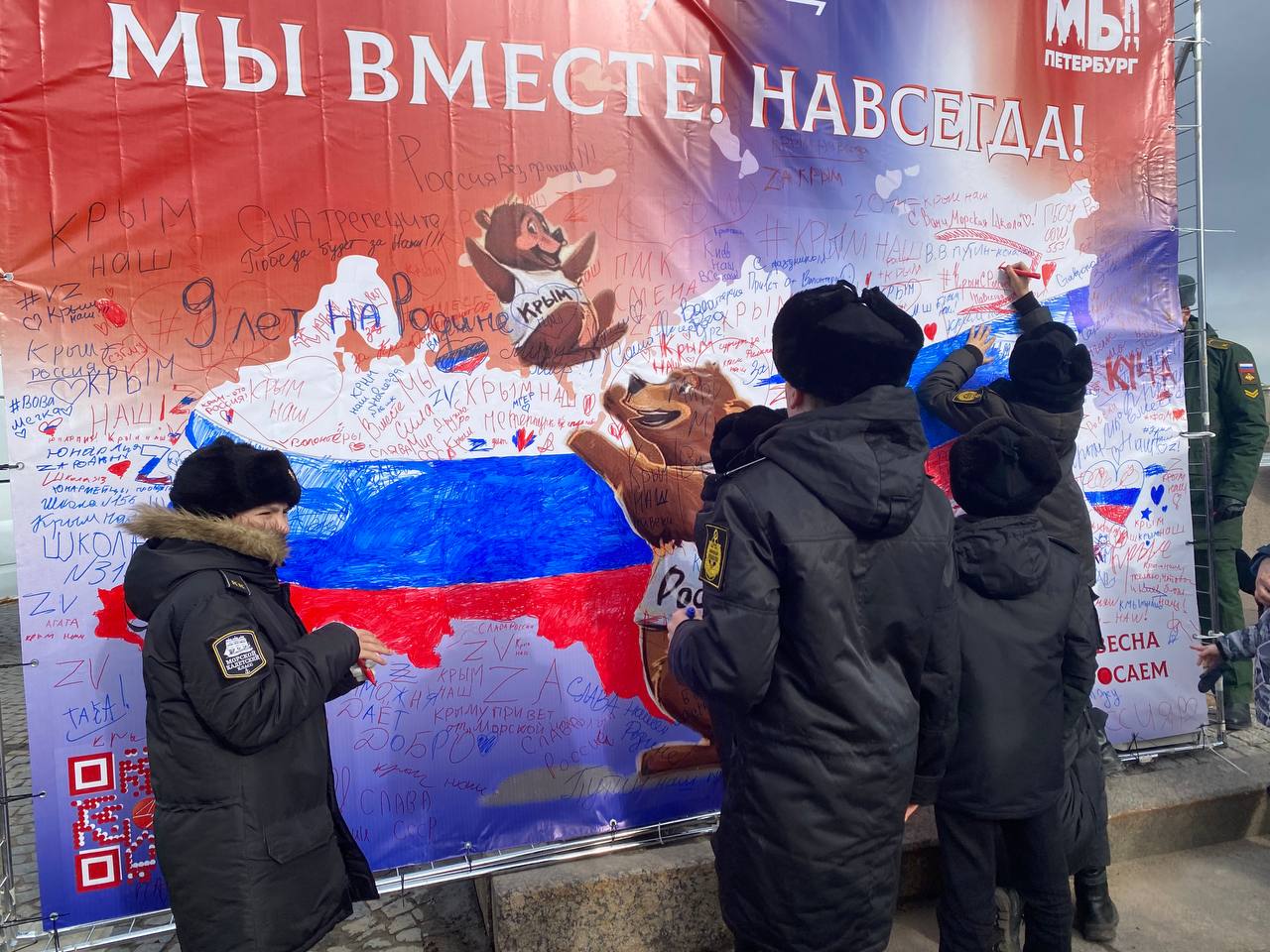 Девятую годовщину аннексии Крыма отметили в Петербурге. Празднование получилось менее масштабным, чем в прошлом году: в центре города устроили автопробег, небольшой митинг-концерт без представителей власти прошел на Стрелке Васильевского острова. На сцене малоизвестные певцы исполняли патриотические песни, а школьники писали маркерами «Крым наш».